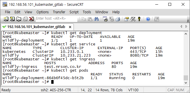 Kubernetes에 deployment인 wildfly-deployment, service wildfly, ingress wildfly-ingress, pods wildfly-deployment-864b6f45dc-b5t2b가 deploy 되어 있는 것을 확인할 수 있습니다.