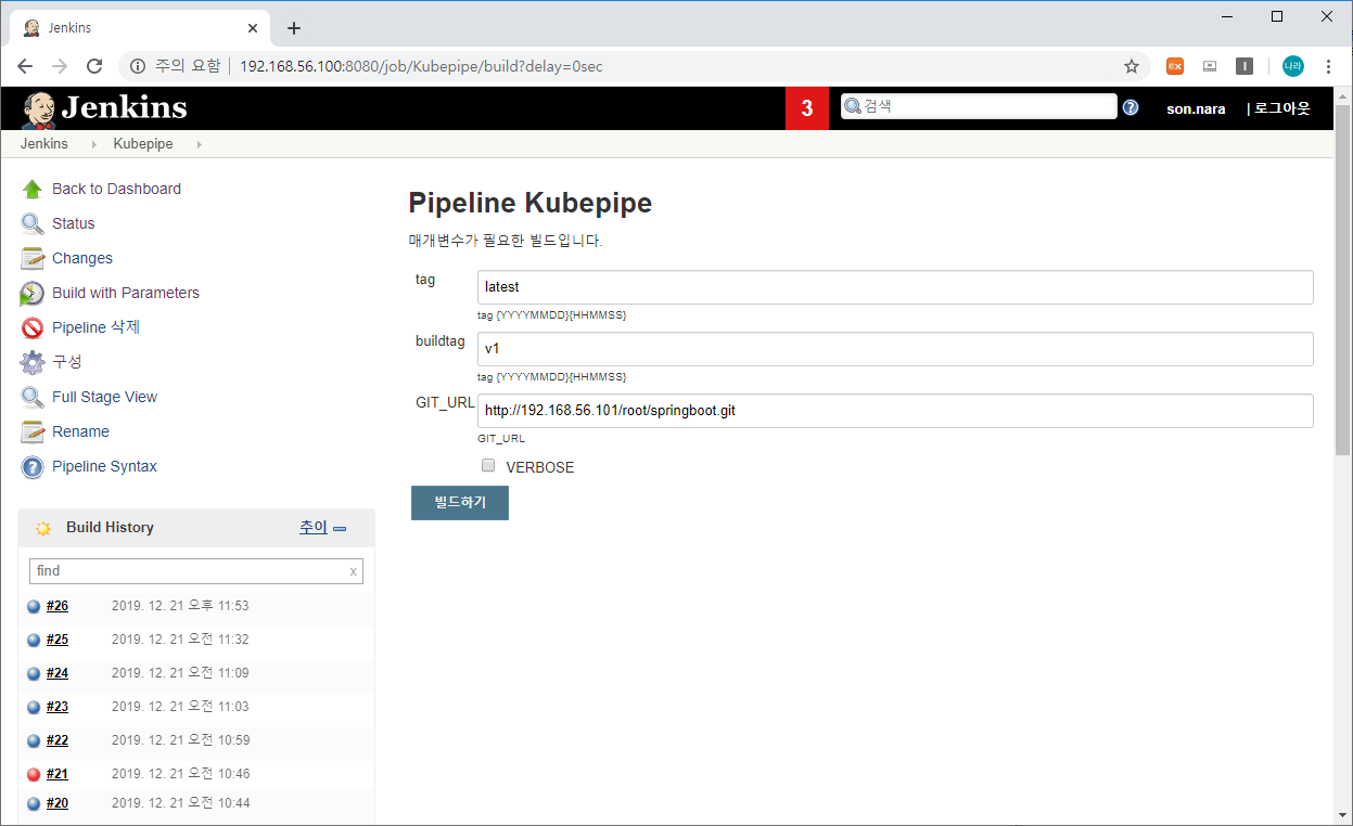 - 위와 같이 Pipeline에서 정의했던 parameter들을 빌드 전에 변경할 수 있습니다.