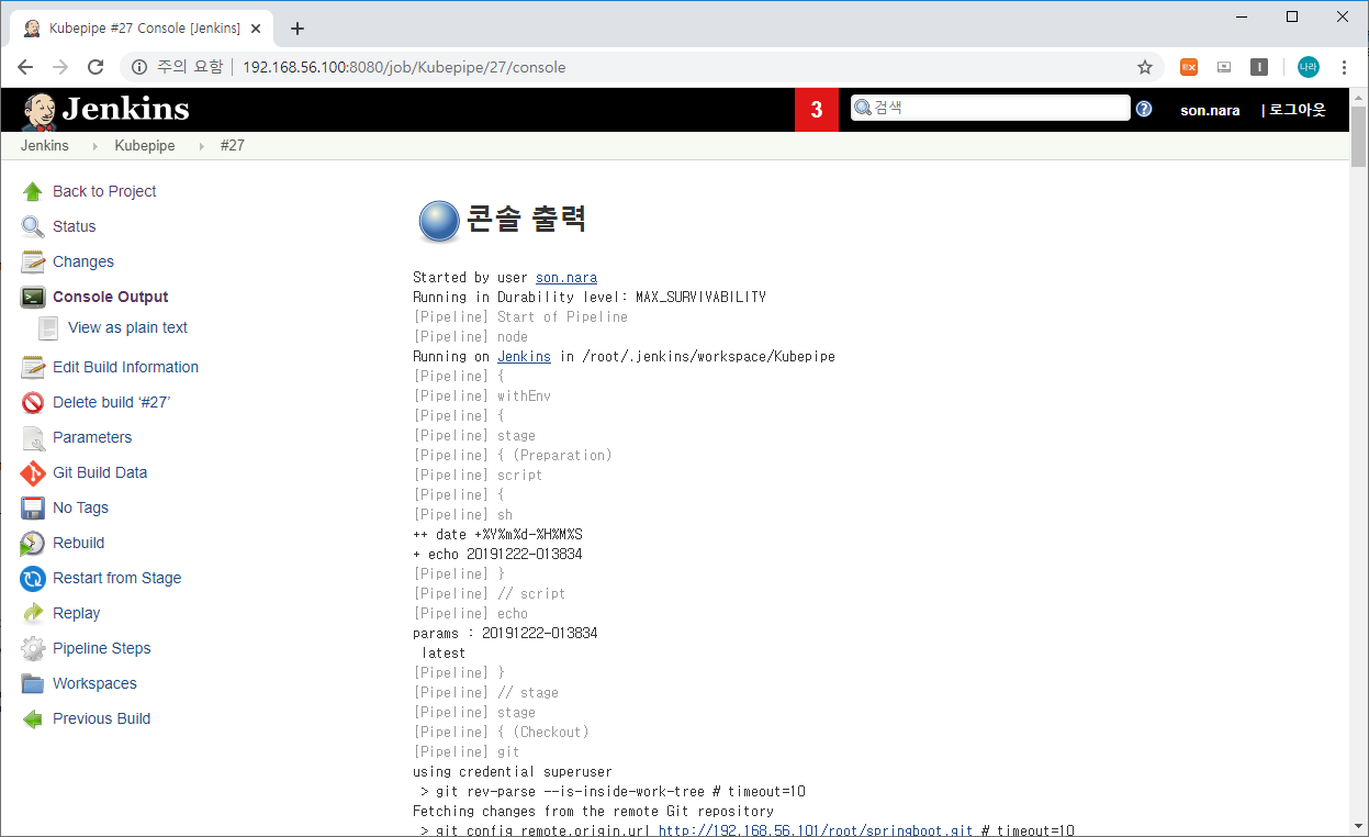 상세 로깅은 왼쪽 Build History에 Build Num을 선택하고 Console Output을 클릭하여 보거나, Stage 위에 마우스 커서를 올려 해당 Stage의 로그만 보는 방법 등이 있습니다.