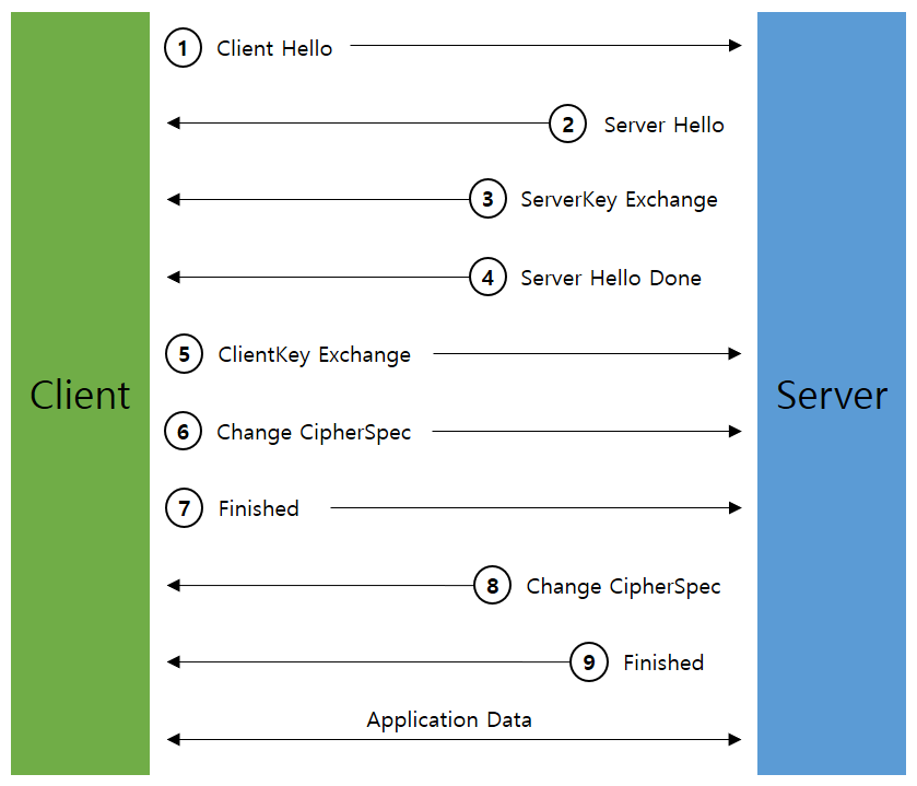 또한 Certificate 메시지를 전송 합니다.(서버 인증서) 이 인증서는 인증 기관에서 발급받은 것이며, 서버가 신뢰할 수 있는 자임을 인증합니다. 전송이 끝나면 ServerHelloDone 메시지를 보내 끝났음을 알립니다.