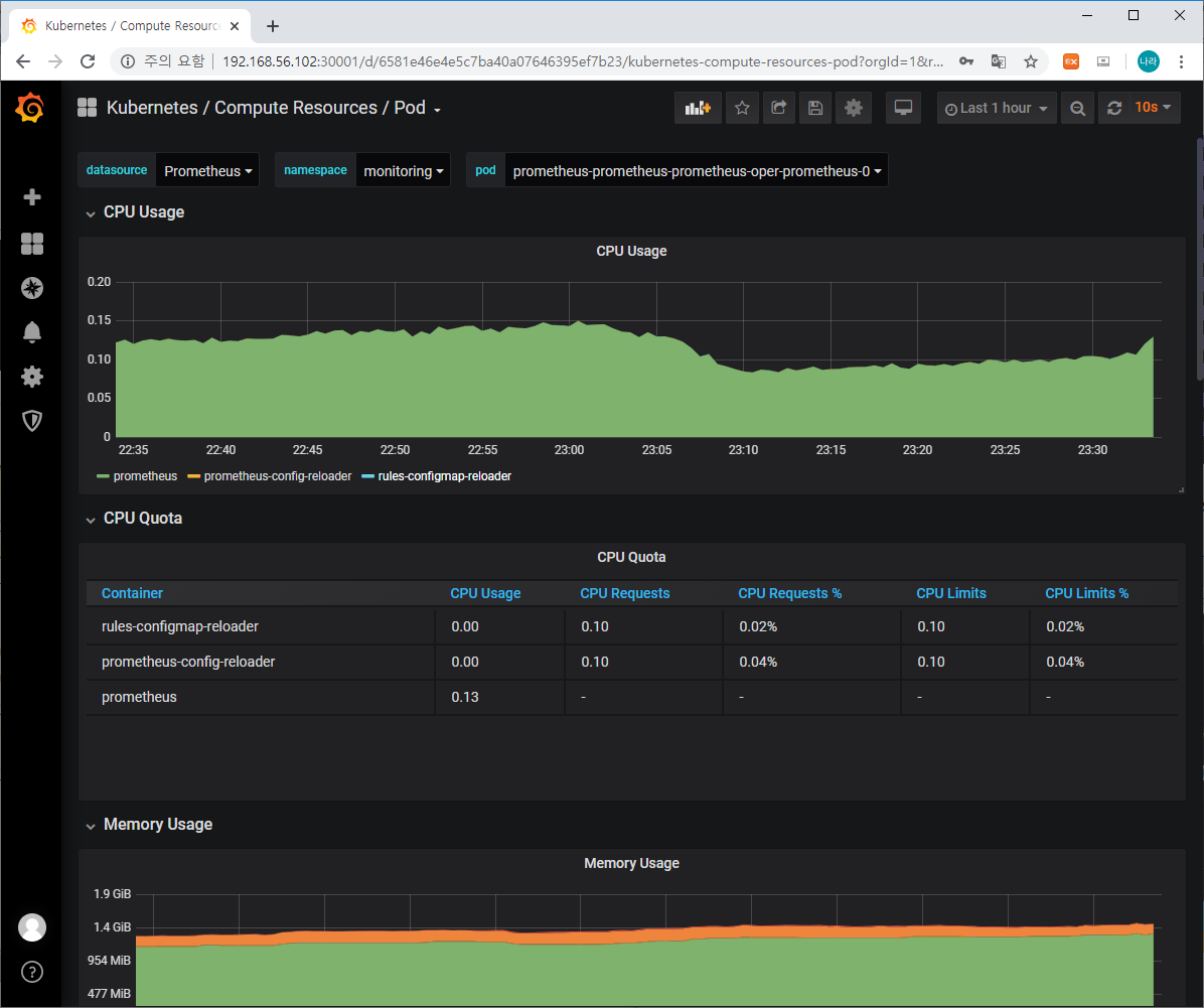 이중 Compute Resources/Cluster, Compute Resources/Namespace(Pod), Compute Resource/Node(Pods), Compute Resources/Pod 등의 리소스를 확인할 수 있습니다.