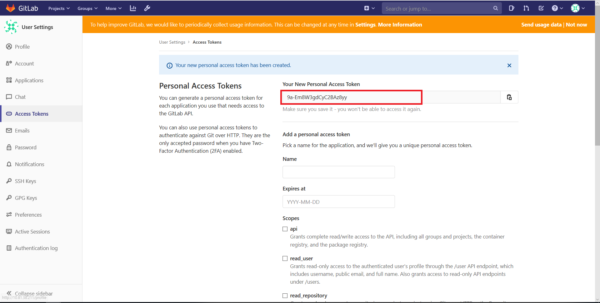우선적으로 GItlab에 접속하여 User Setting에서 Personal Access Token을 얻는다.