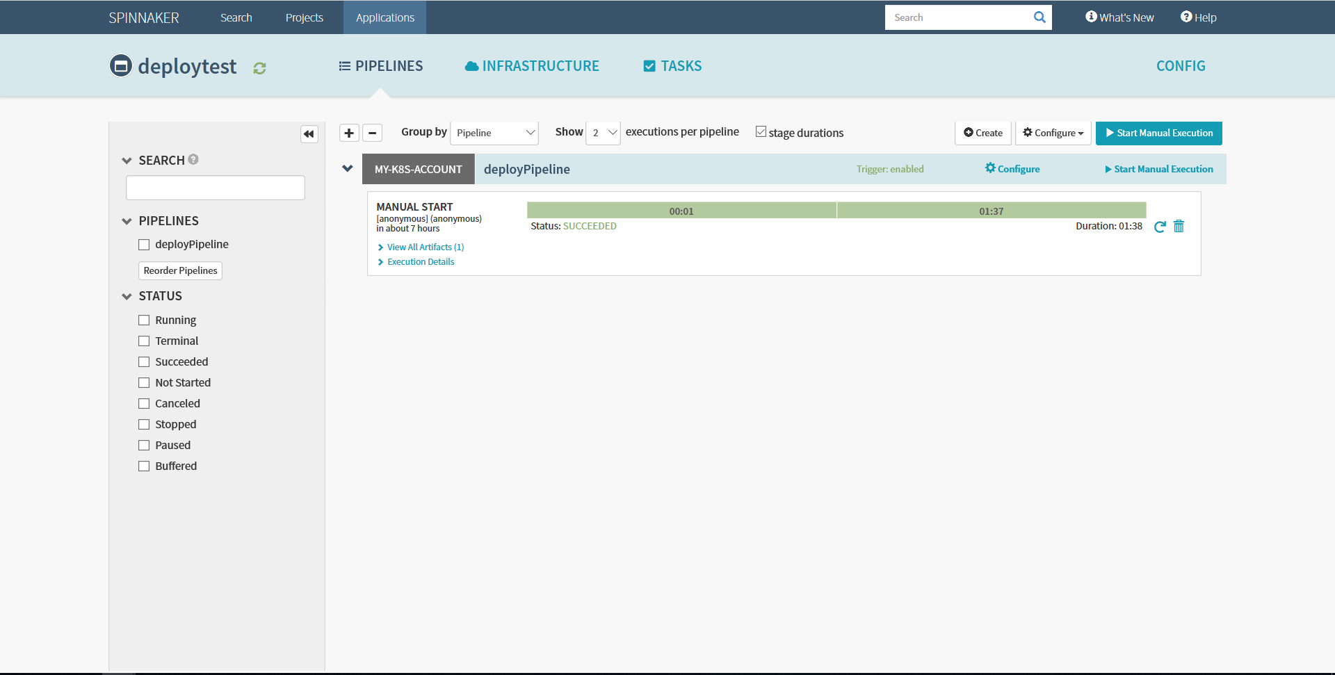 마지막으로 배포 단계만 남았다. Add Stage를 하고 deploy를 선택한다. account 는 spinnaker 설치시 공급자 계정으로 추가했던 계정을 선택한다. Manifest는 artfiact로 bake stage에서 만드는 artifact를 설정한다. 아래와 같이 하면 deploy stage 기본 설정이 완료된다.