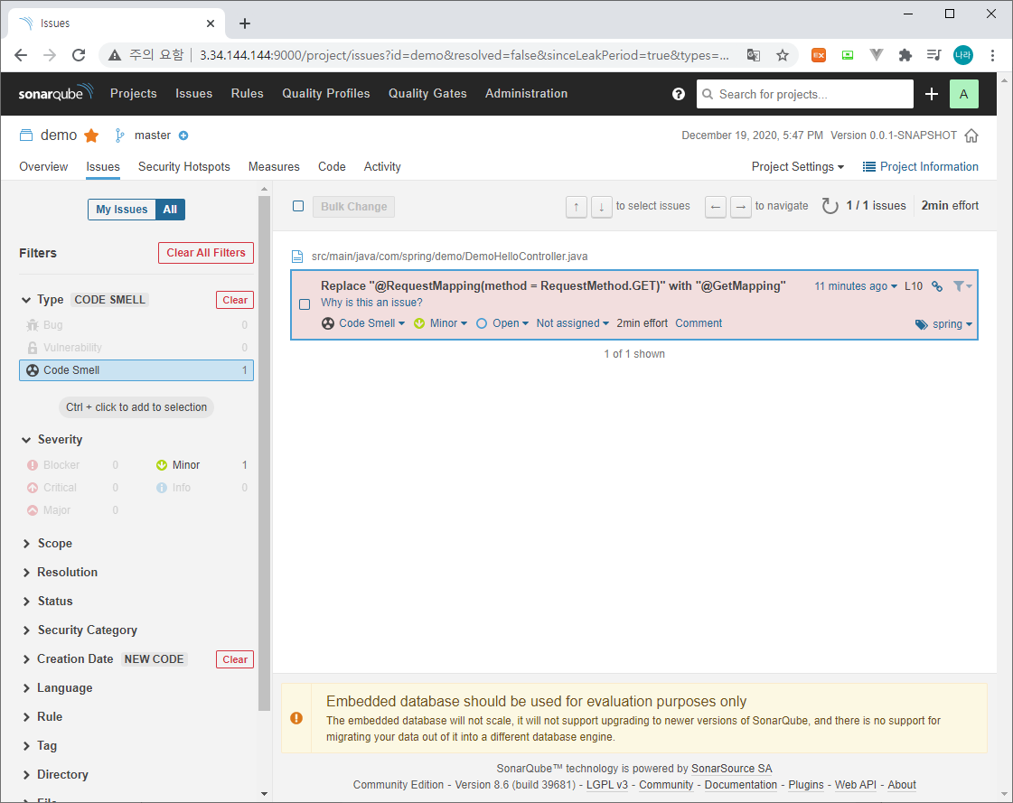 1) Bugs, Vulnerabilities, Code Smell, Security Hotspots, Dept 등의 이슈를 직접 처리하는 과정