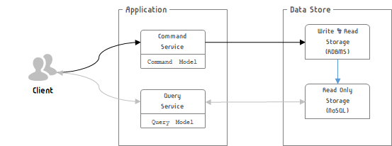 각각의 역할을 구분하여 처리하는 애플리케이션을 구성하고 Event Store는 하나의 RDBMS 또는 CUD는 RDBMS, R은 NoSQL로 구성하여 중계 브로커를 통해 CUD 결과를 NoSQL과 동기화 하는 방식을 적용할 수 있다.
