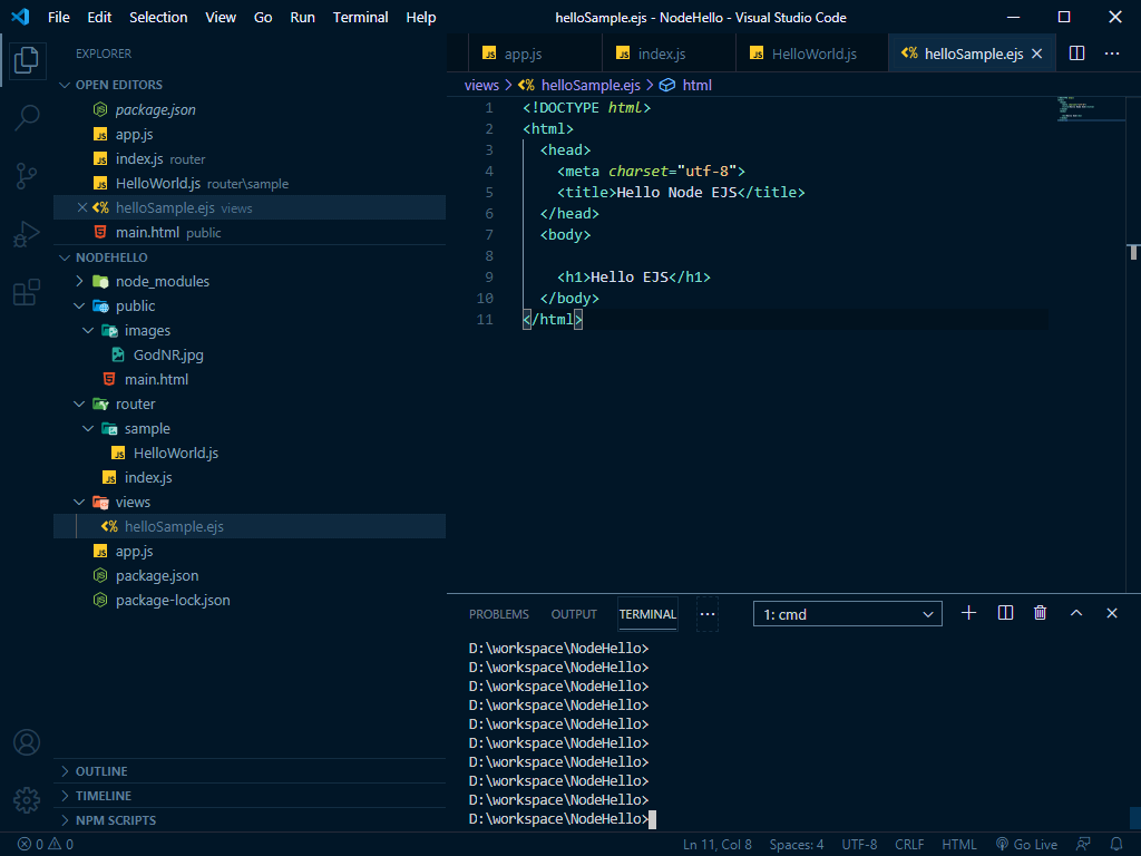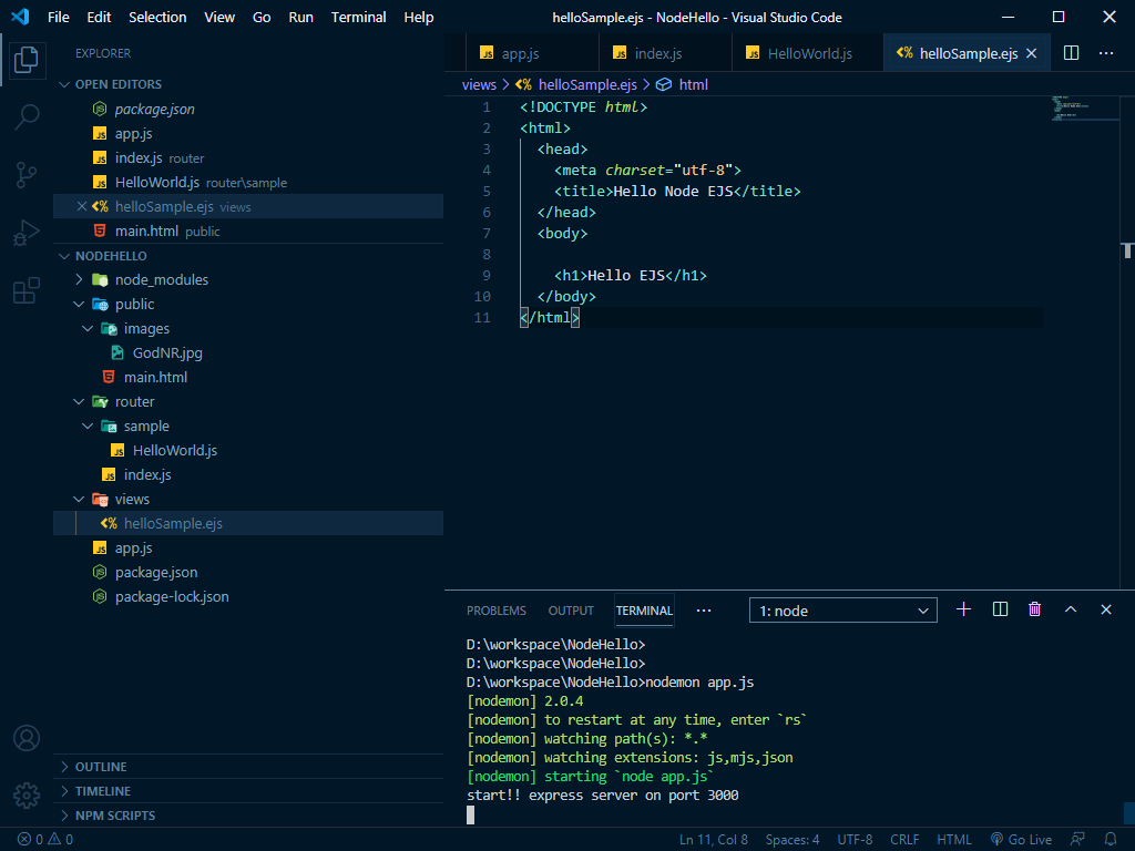 마지막으로 ejs 파일이 하는 views 하위 helloSample.ejs 파일이다.