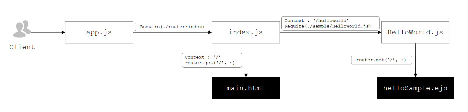 HelloWorld variable은 router/sample/HelloWorld.js 모듈을 불러오기 위해 require로 정의된다.