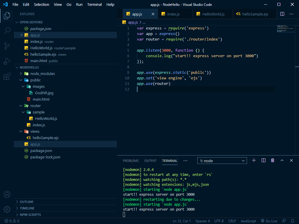 다음으로 node를 통해 app.js를 기동해 보도록 하자.