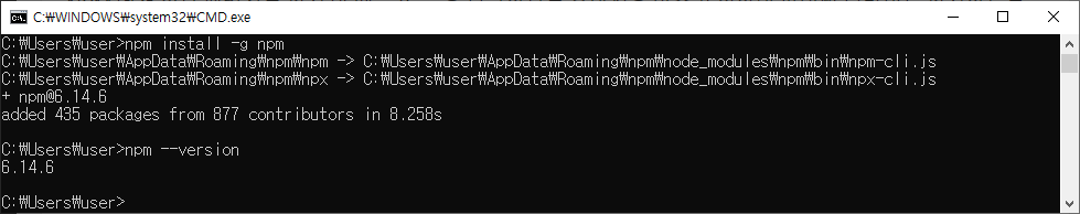 위와 같이 -g 옵션이 없는 local 설치의 경우 해당 NodeJS Project 하위의 node_modules에 module이 설치가 되지만, -g 옵션을 추가하여 global 옵션을 적용할 경우 계정 하위 AppData에 node_module이 설치가 된다. 이로 인해 모든 프로젝트에서 공유해서 해당 모듈을 사용할 수 있도록 한다.