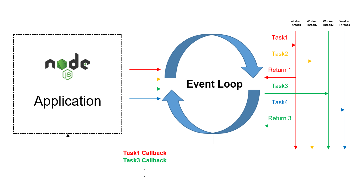 위 이미지는 Node.JS Application이 Event Loop를 통해 병렬로 동시에 처리되는 과정을 설명한다. 동시에 4개의 Task가 요청이 들어올 경우 Event Loop는 Task의 처리 과정을 관장하여 동시에 Multi Thread 환경 처럼 동작하도록 관리한다. 이는 실제는 Node.JS에서 처리되는 것이 아닌 Node.JS가 기동되어 있는 호스트 커널의 Multi Thread 동작방식을 이용한 것이다.