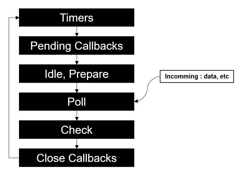 각 단계는 무한루프를 돌며 처리 되고, 단계 별 실행할 FIFO 콜백 대기열이 존재한다. 이벤트 루프가 특정 단계에 진입하면 해당 단계와 관련된 작업을 수행한 다음 큐가 소진되거나 최대 콜백 수까지 해당 단계의 큐에서 콜백을 실행한다. 큐가 소진되었거나 콜백 처리 임계치에 도달하면 이벤트 루프가 다음 단계로 이동하는 방식으로 처리된다. 다음은 각 단계별 상세 설명이다.
