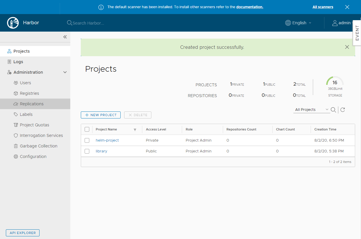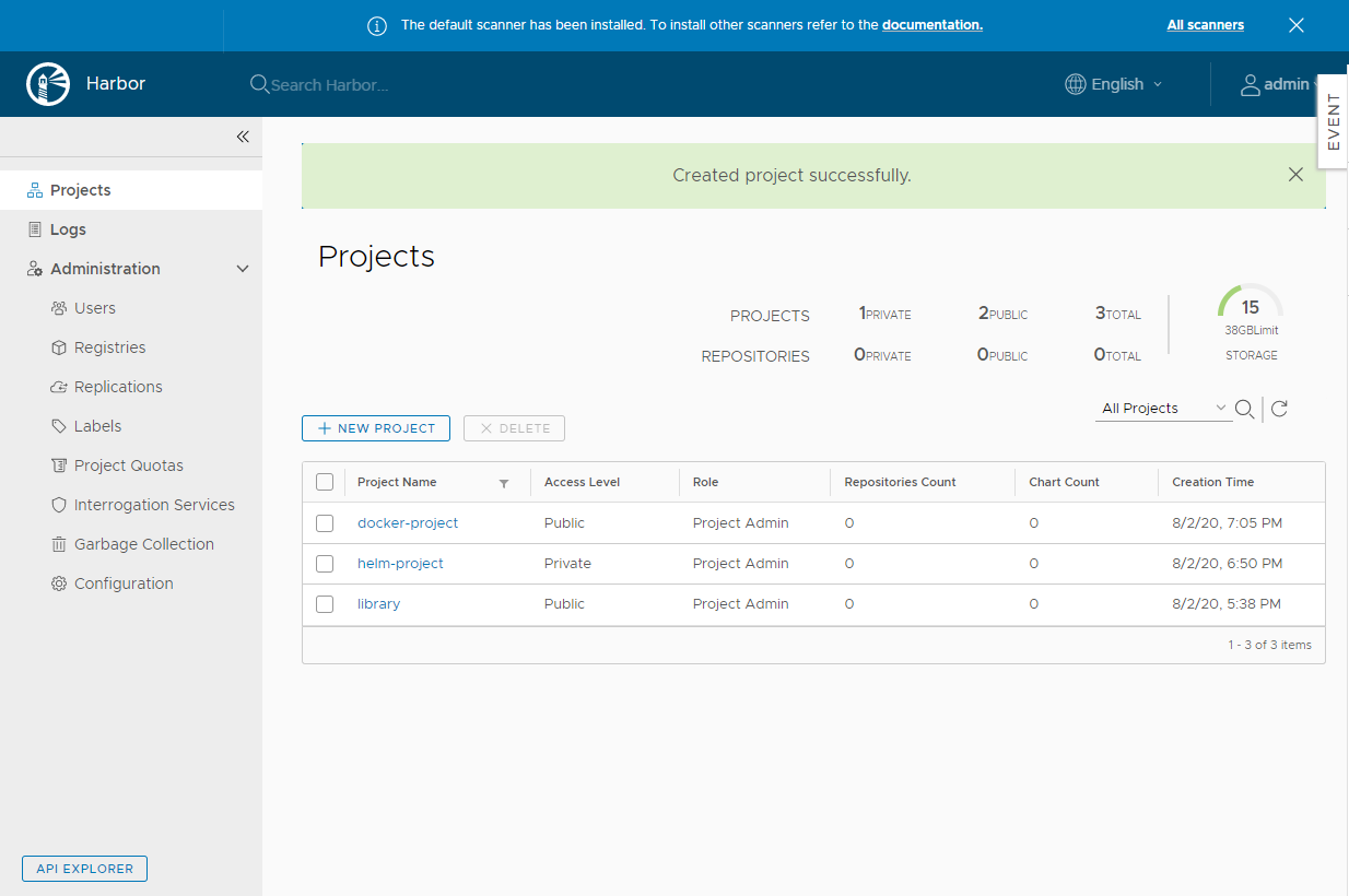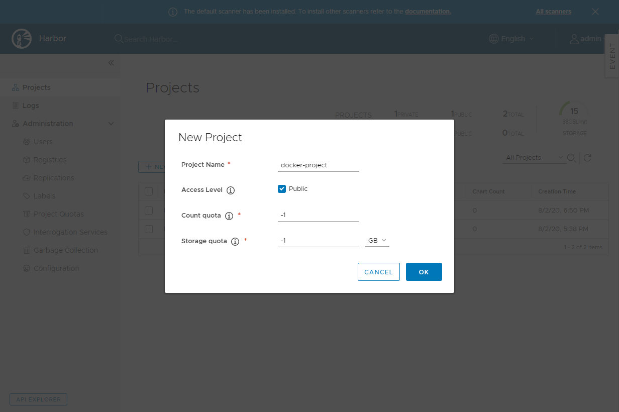 Harbor Project는 하나의 Repository 단위를 표현하며, Docker Repository, Helm Repository, File Repository 또는 그 묶음을 표현할 수 있다. 본 가이드에서는 helm-project & docker-project를 각각 생성하도록 한다.
