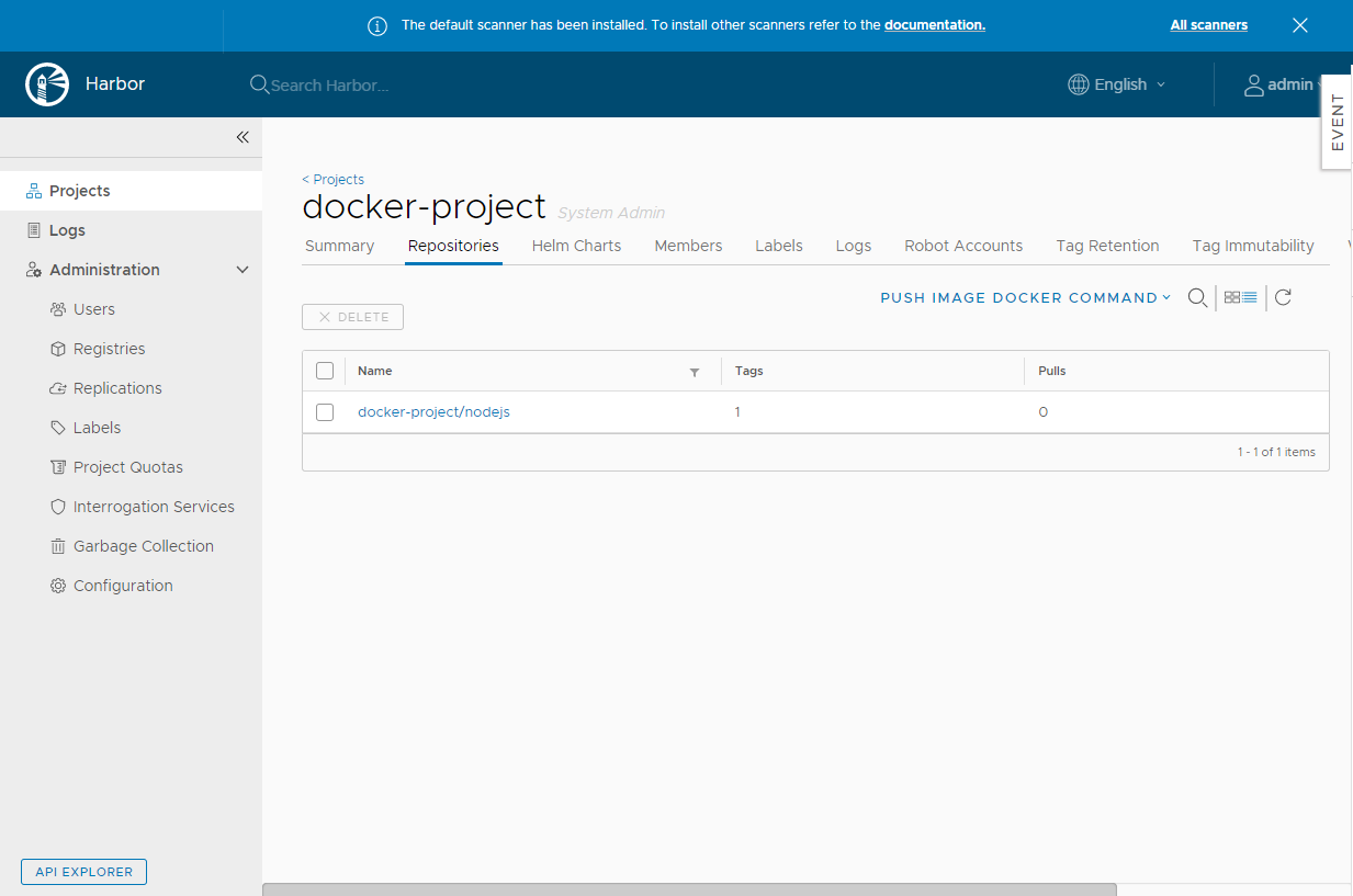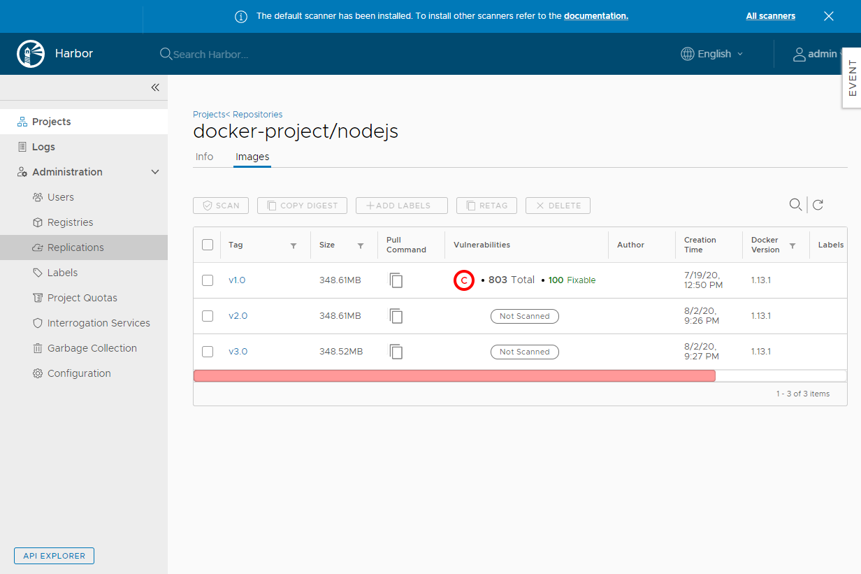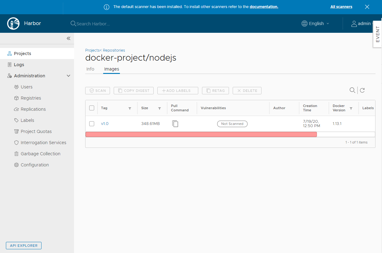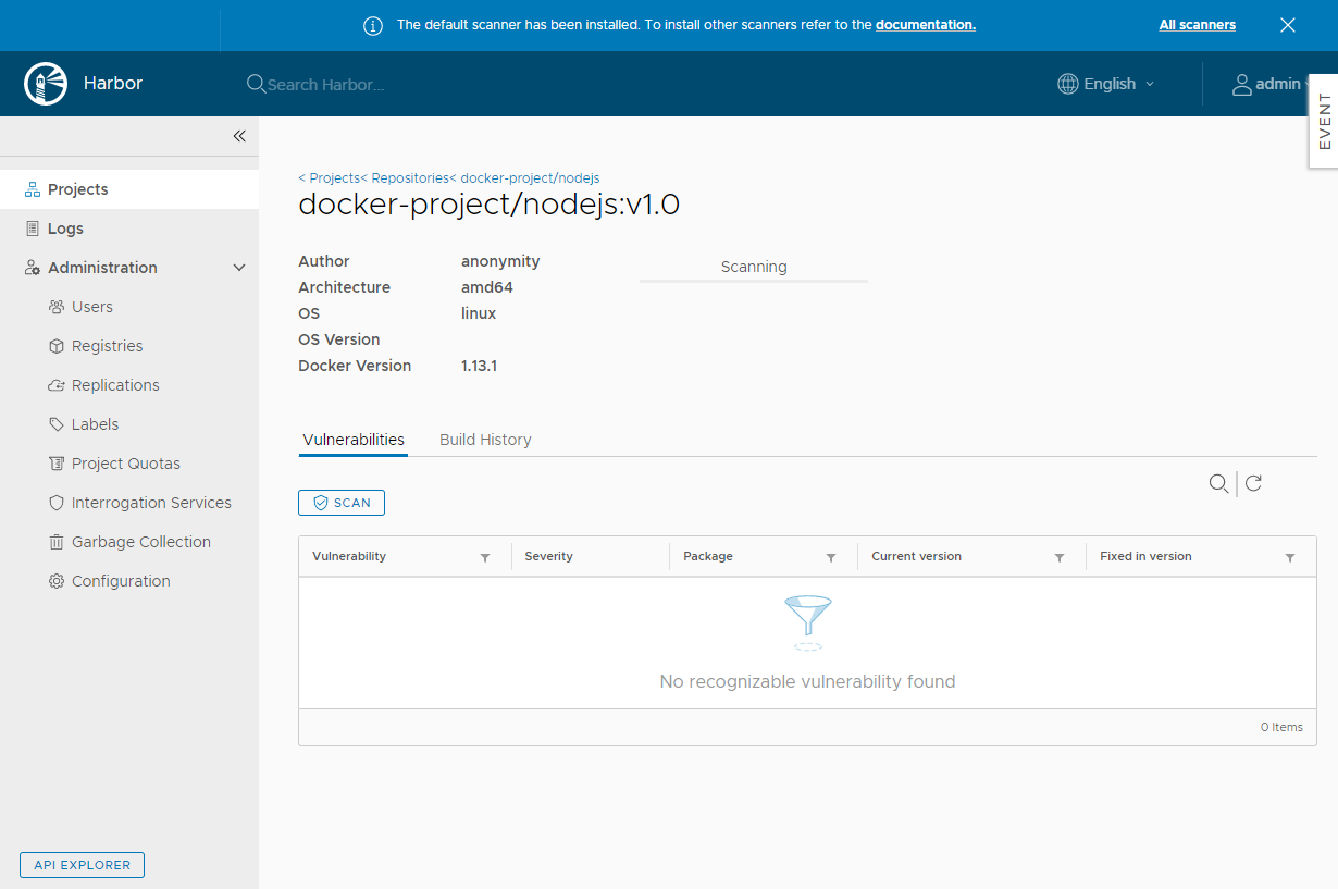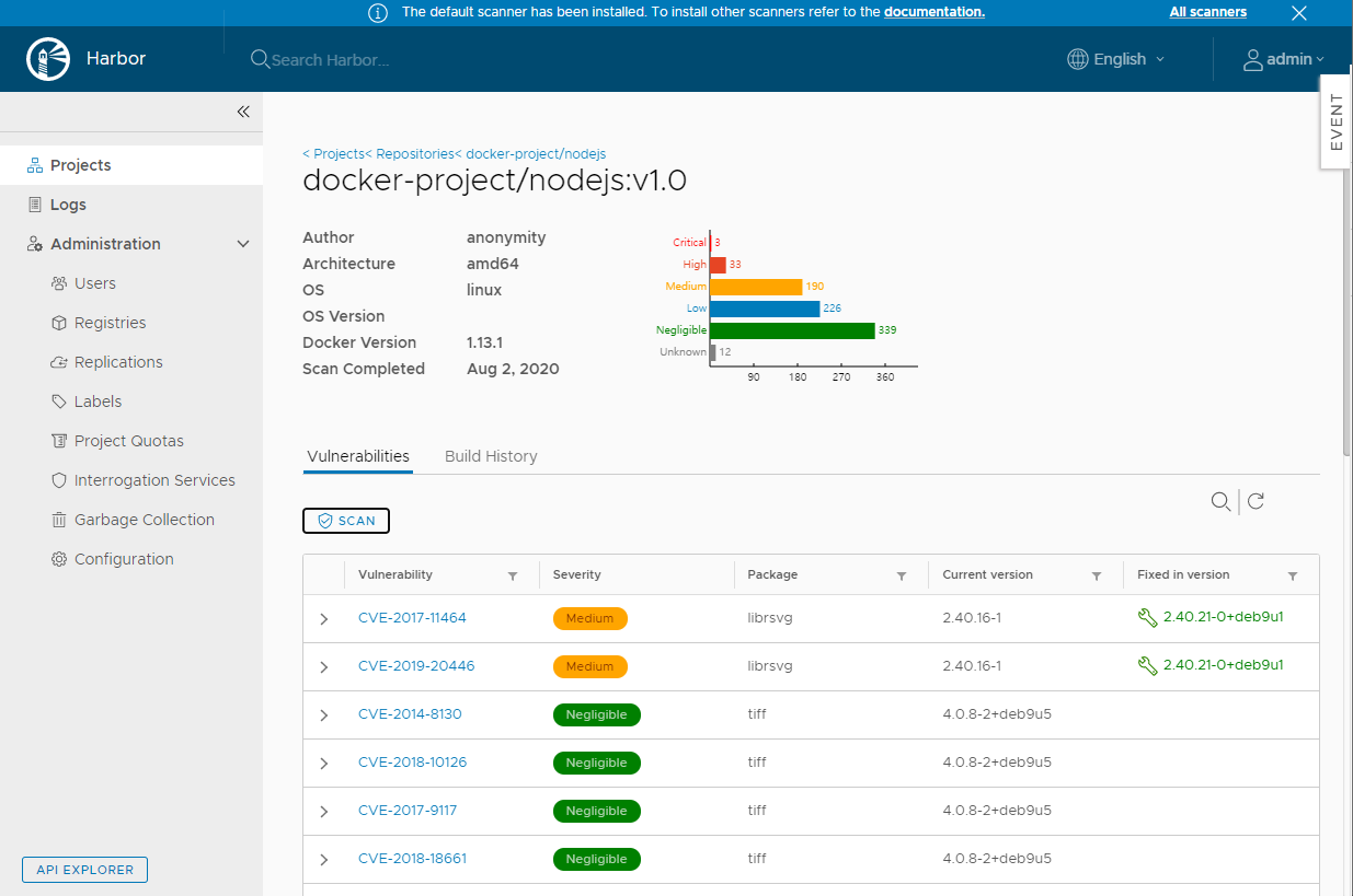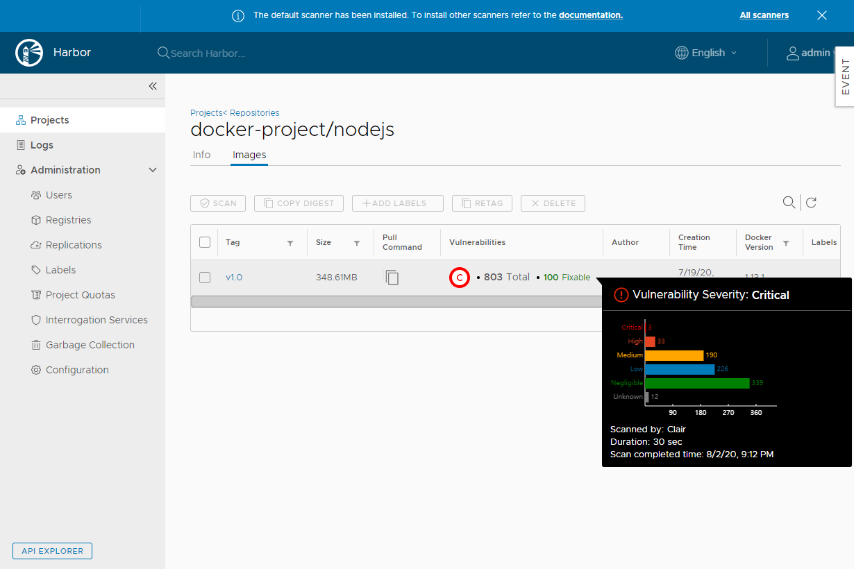 다음으로 Docker Image 취약점 분석을 진행해 보자. 이미지 분석은 Clair를 통해 진행하며, --with-clair 옵션을 기동 시점에 추가하였다면, 별다른 구성없이 Harbor 대시보드에서 사용할 수 있다.