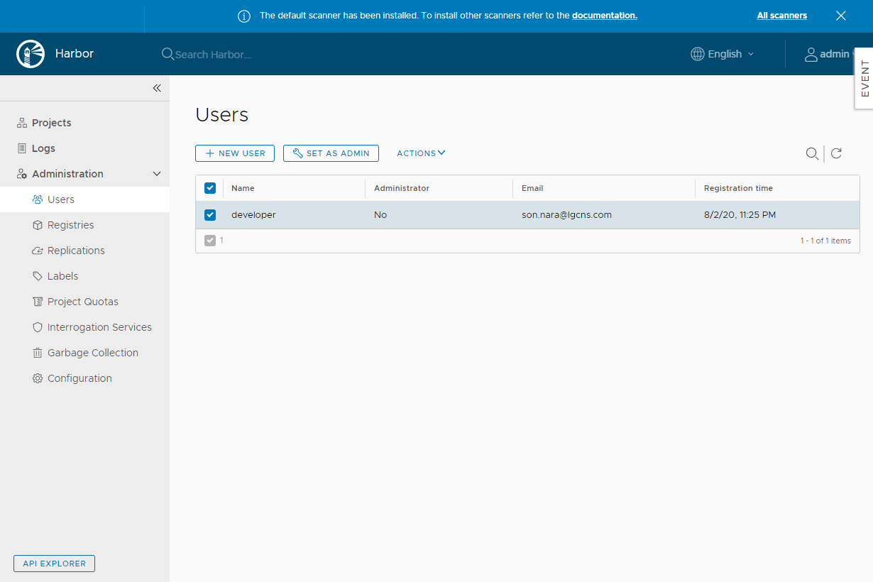 Harbor는 admin 사용자 외에 User를 생성하여 권한이 구분된 접속을 제공할 수 있다.