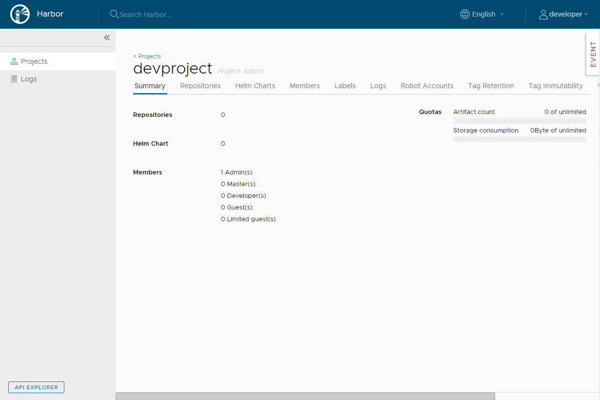 위는 developer 사용자가 devproject를 생성한 화면이며, 해당 project에 대해서는 모든 권한을 부여하고 적용할 수 있다.