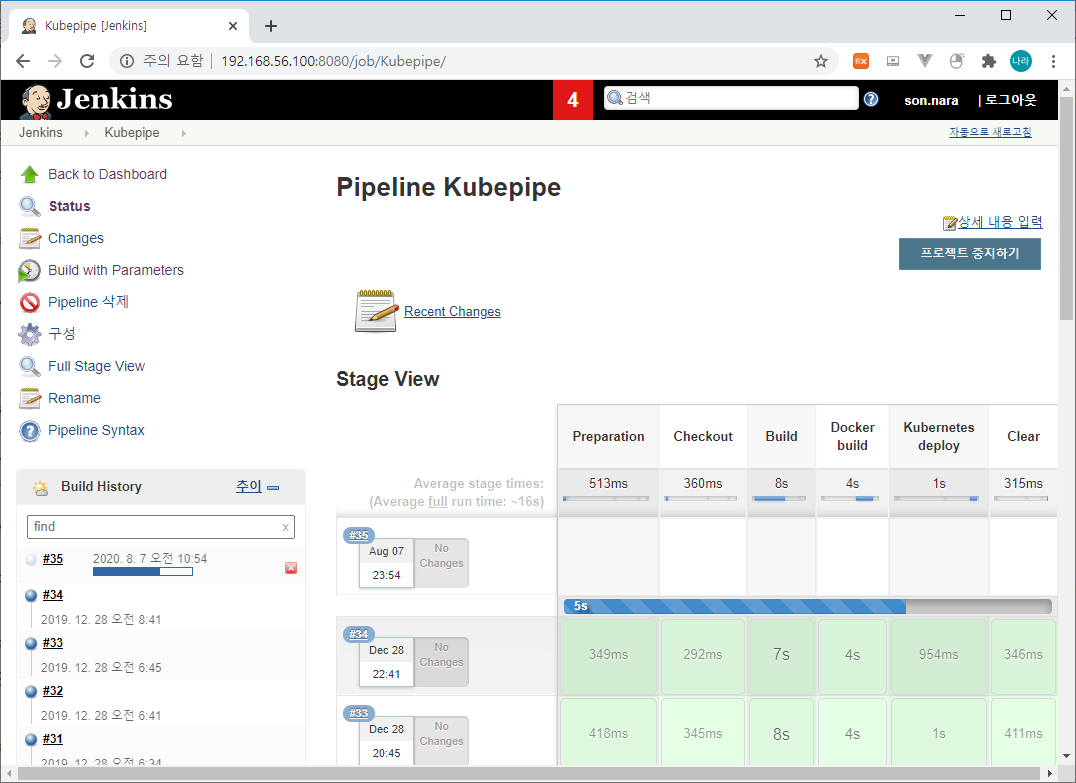 on":17208,"executor":null,"fullDisplayName":"Kubepipe #35","id":"35","keepLog":false,"number":35,"queueId":1,"result":"FAILURE","timestamp":1596812043673,"url":"http://192.168.56.100:8080/job/Kubepipe/35/","changeSets":[],"culprits":[],"nextBuild":null,"previousBuild":{"number":34,"url":"http://192.168.56.100:8080/job/Kubepipe/34/"}}[root@ciserver jenkins]#