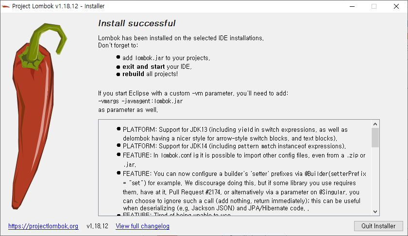 위와 같이 적용 후 Eclipse를 재기동하고 Re build를 실행하면, Lombok 라이브러리가 적용되는것을 확인할 수 있을 것이다.