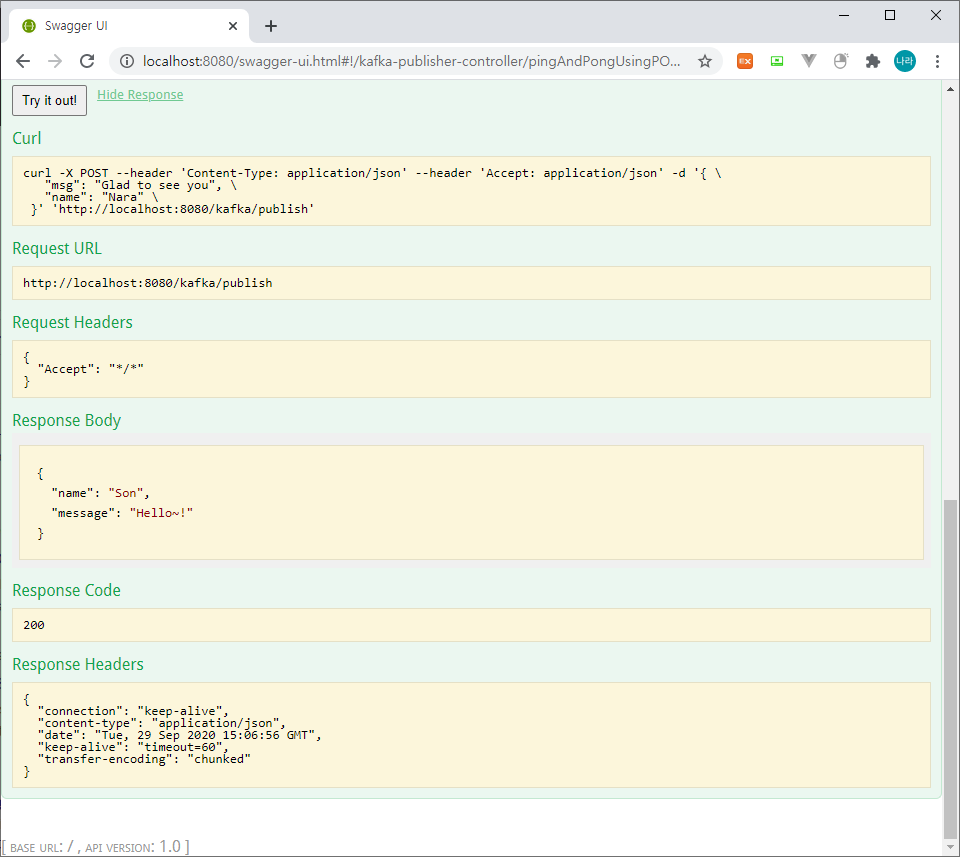 위와 같이 Swagger-UI에 접근하여 아래와 같이 kafka-publisher-controller API를 테스트할 수 있다.