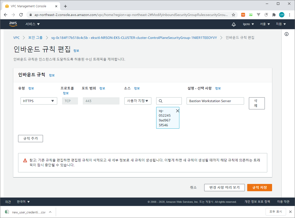 기본 생성되는 컨트롤 플레인 보안 그룹에는 인바운드 HTTPS 443이 포함되어 있지 않아 수동으로 추가해 주어야 한다.