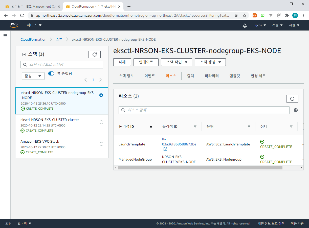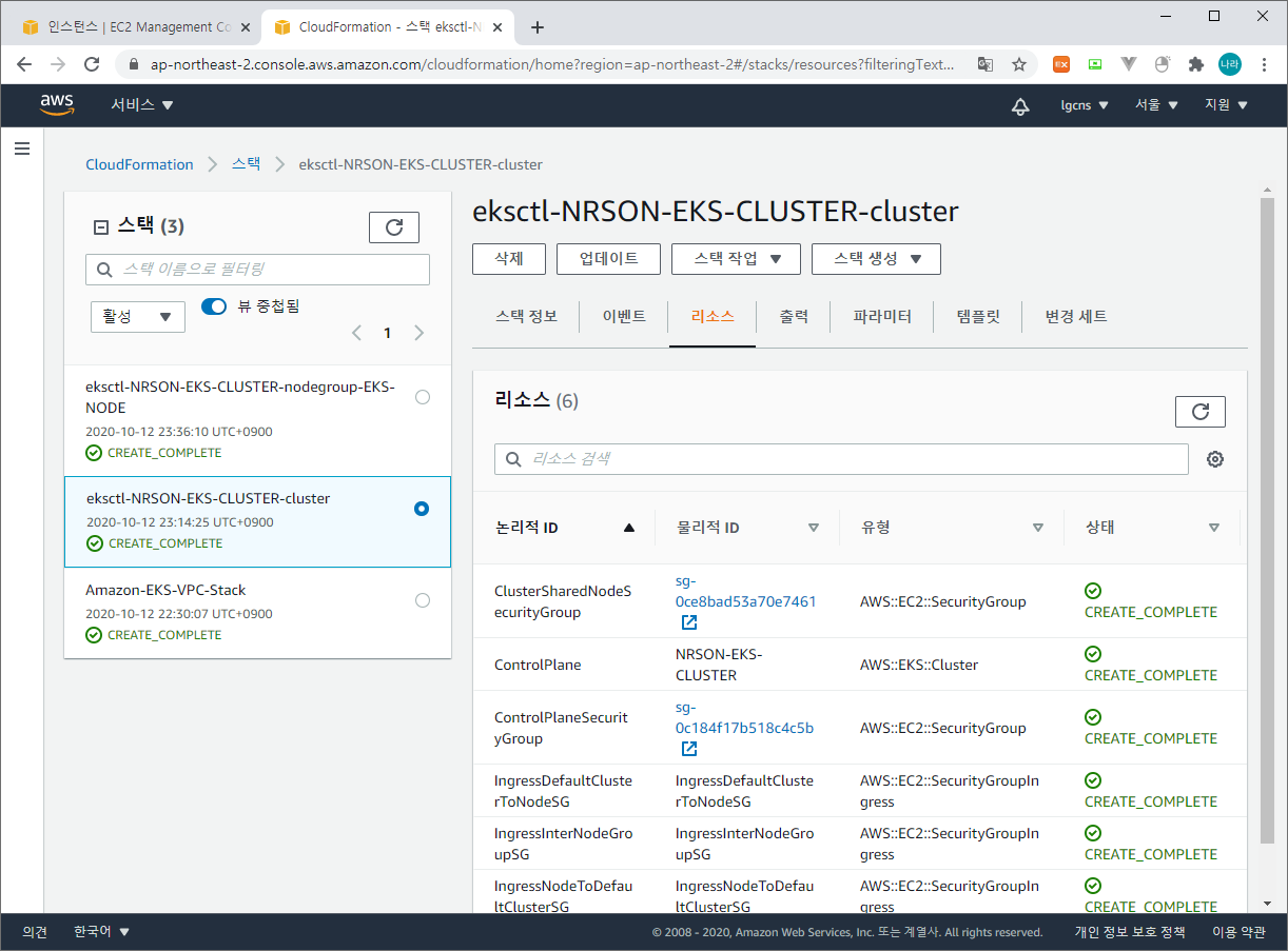 [ to cleanup resources, run 'eksctl delete cluster --region=ap-northeast-2 --name=EKS-AN2-MSA'