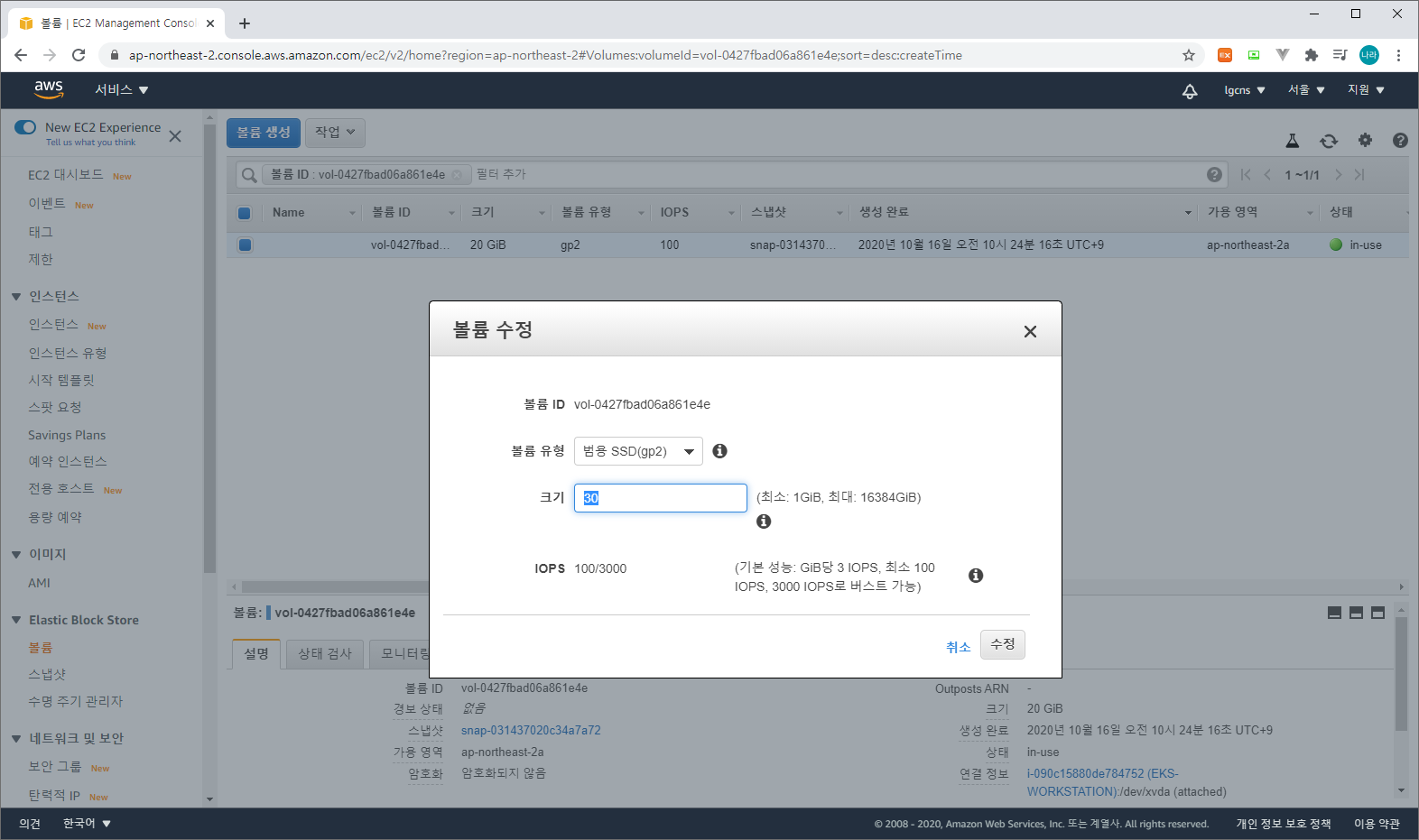 EC2 > 스토리지 탭 > 스토리지 선택 > 작업 > 볼륨 수정