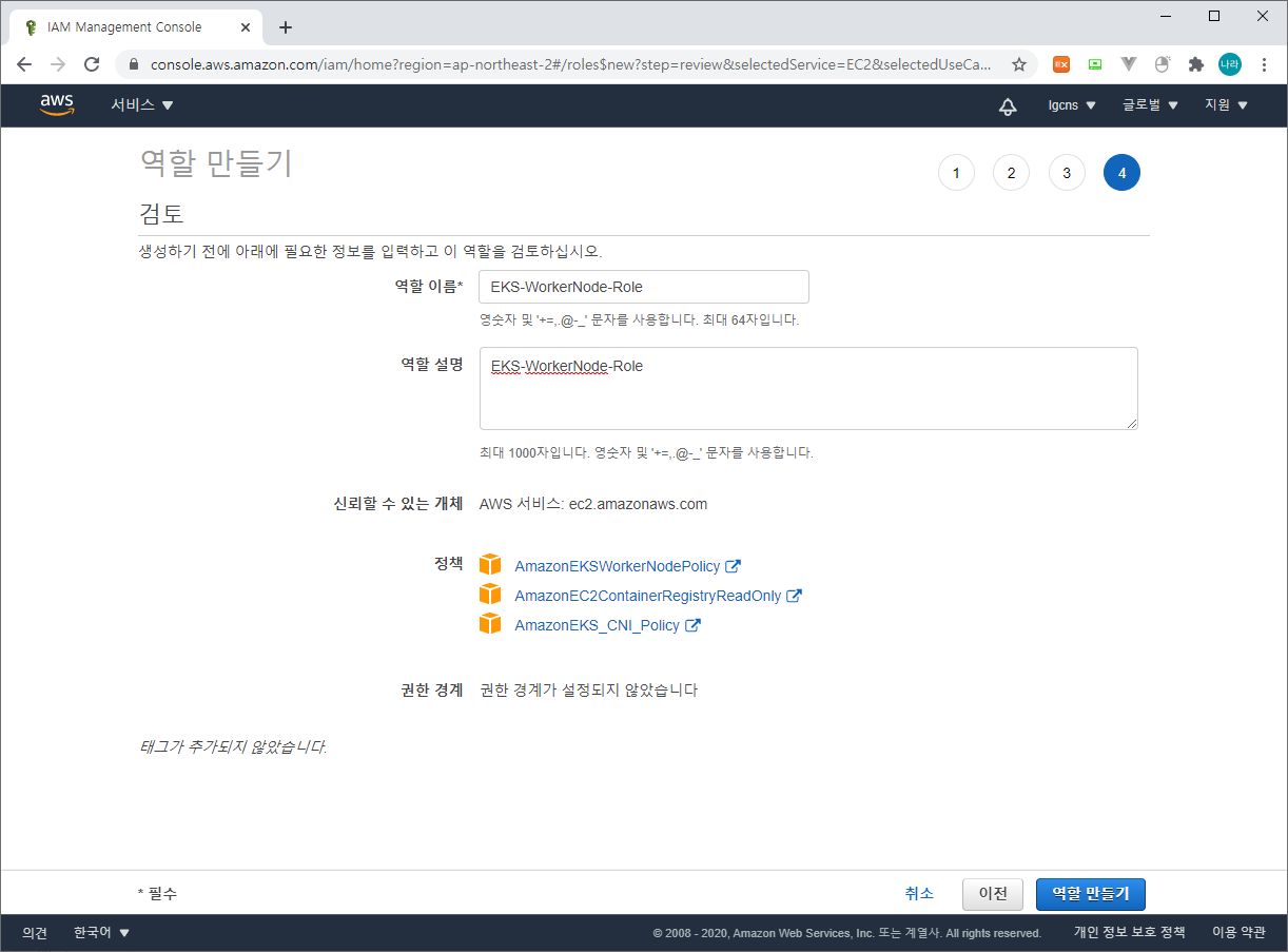 WorkerNode를 위한 Role의 경우 위 AmazonEKSWorkerNodePolicy, AmazonEC2ContainerRegistryReadOnly, AmazonEKS_CNI_Policy를 추가해 준다.