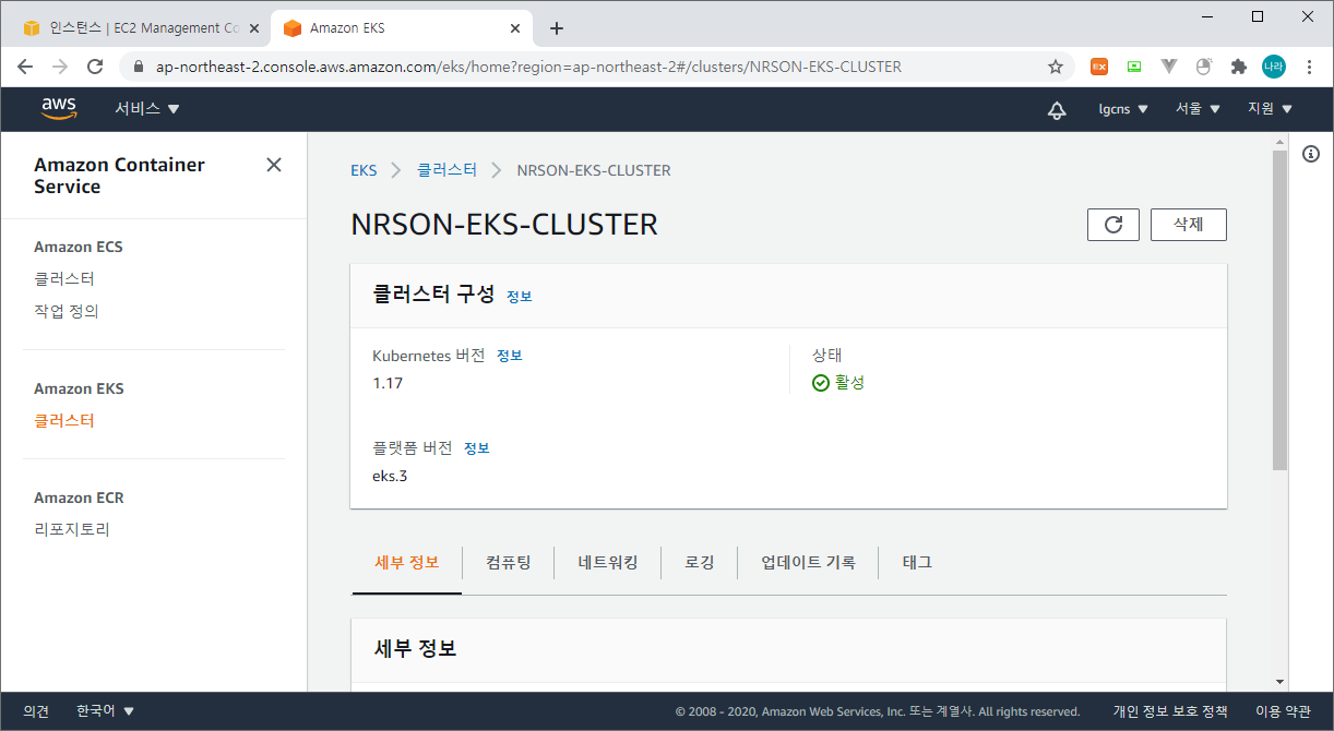 삭제 후 eks console에서 삭제 여부를 확인한다.