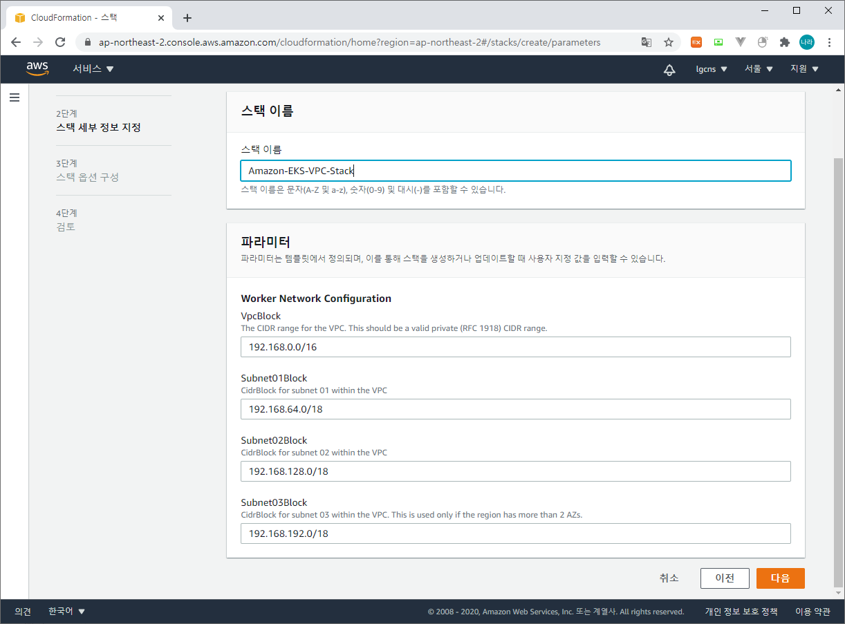스택 이름과 Worker Network의 VPCBlock & Subnet Block을 지정한다.