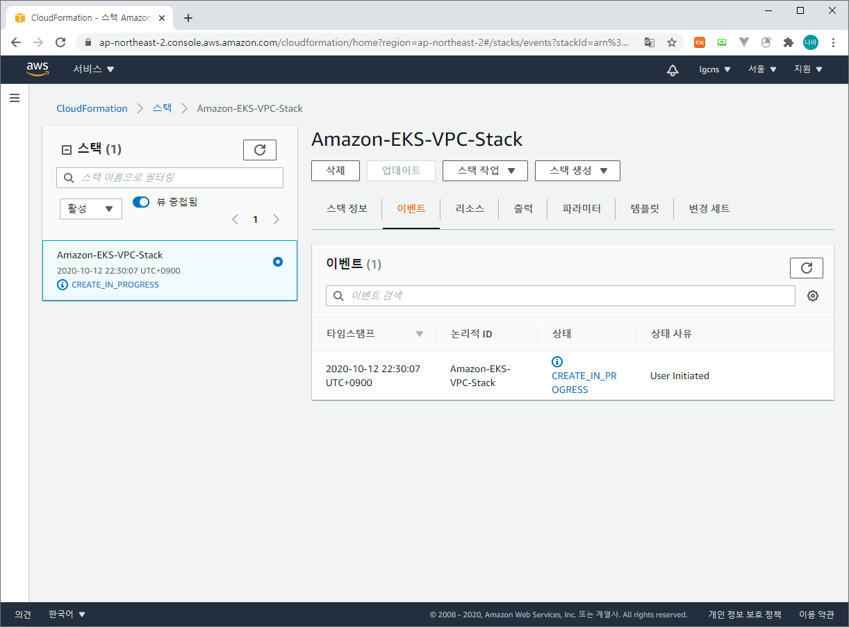 그 밖에 태그 지정 등을 통해 스택 생성을 클릭하면 CloudFormation에 정의한데로 VPC가 생성된다.