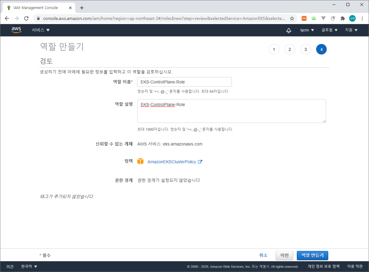 역할은 ControlPlane을 위한 용도와 WorkerNode를 위한 용도 총 2개를 생성한다.