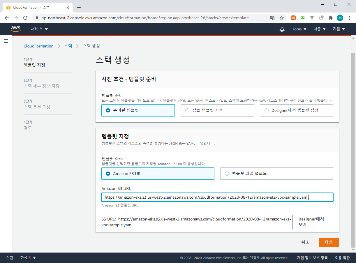 다음과 같이 준비된 템플릿 > Amazon S3 URL > Amazon S3 URL 입력창 (https://amazon-eks.s3.us-west-2.amazonaws.com/cloudformation/2020-08-12/amazon-eks-vpc-sample.yaml) > 다음 버튼