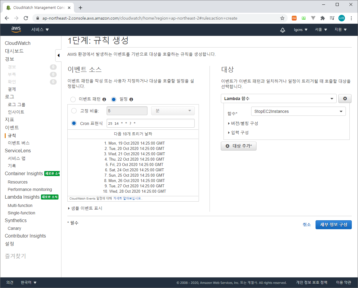 - Cron 표현식 : GMT 기준 Cron 표현식으로 규칙을 생성한다. 자세한 Cron 표현식은 다음을 참고하자.