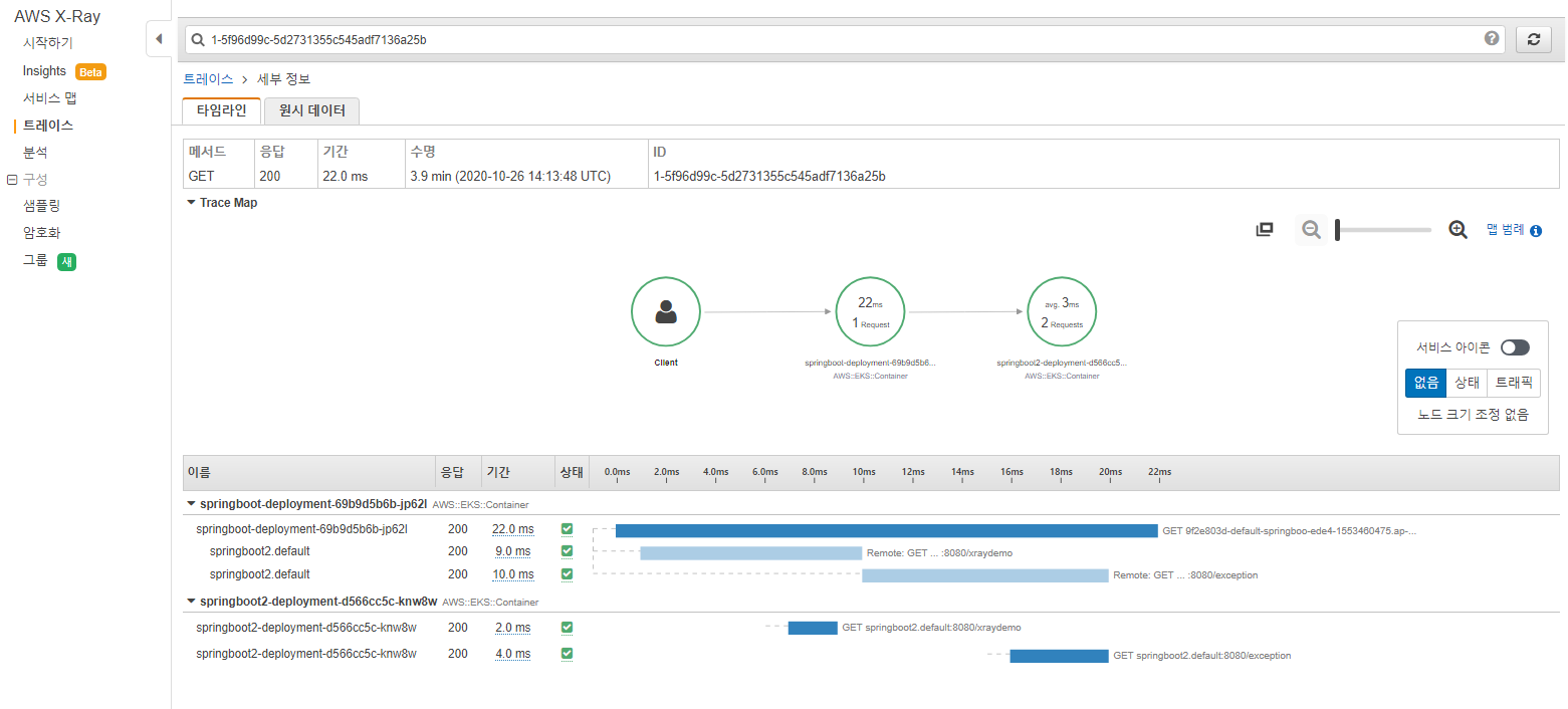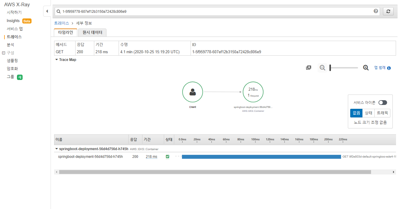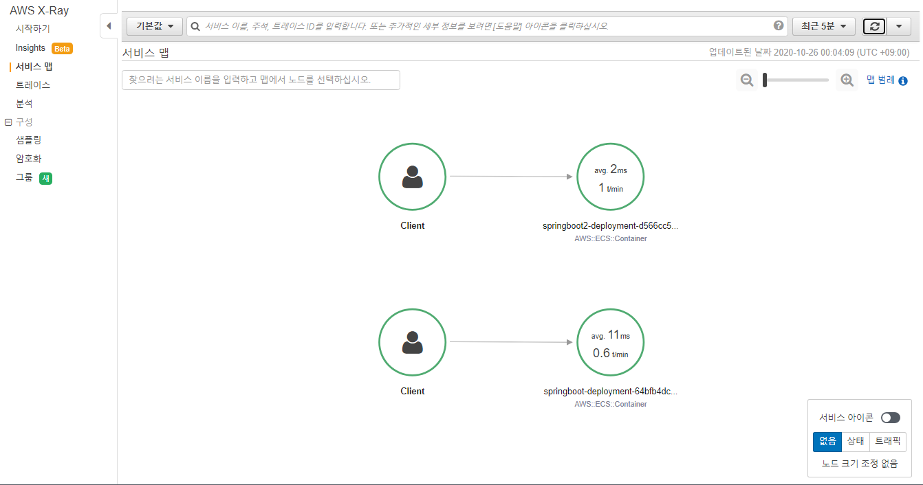 alb ingress가 사용하는 healthcheck url을 사전에 정의할 수 있다. 해당 url은 주기적으로 호출되는 URL이며, 이는 X-Ray에서 수집하지 않도록 앞서 sampling-rules.json에 정의하였다.