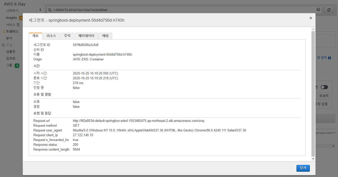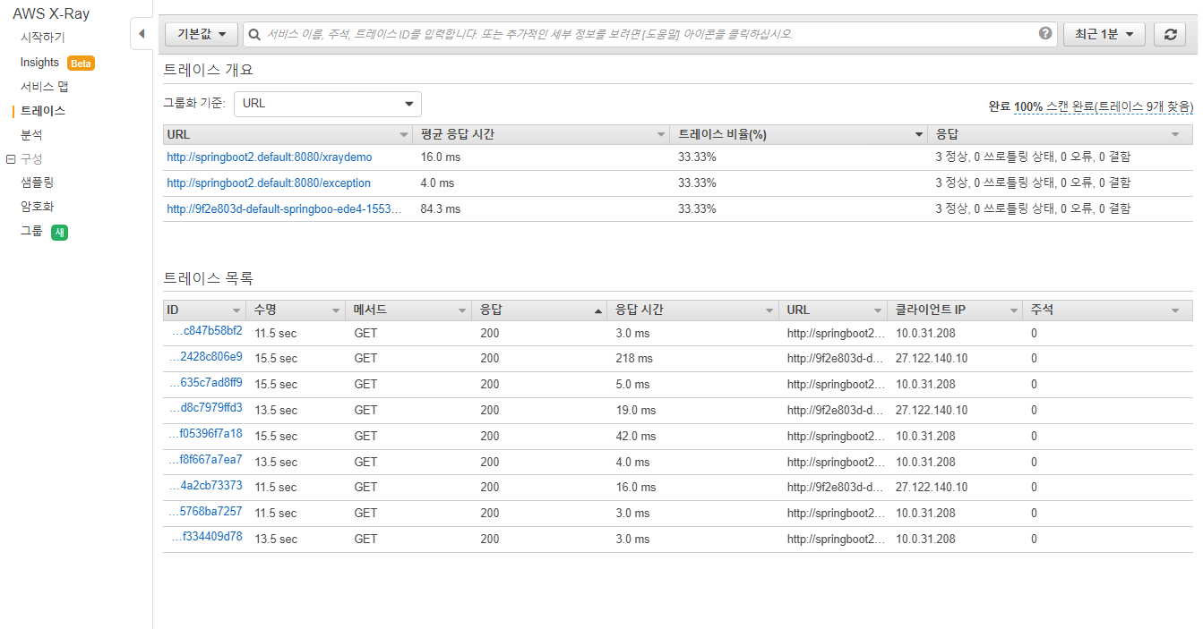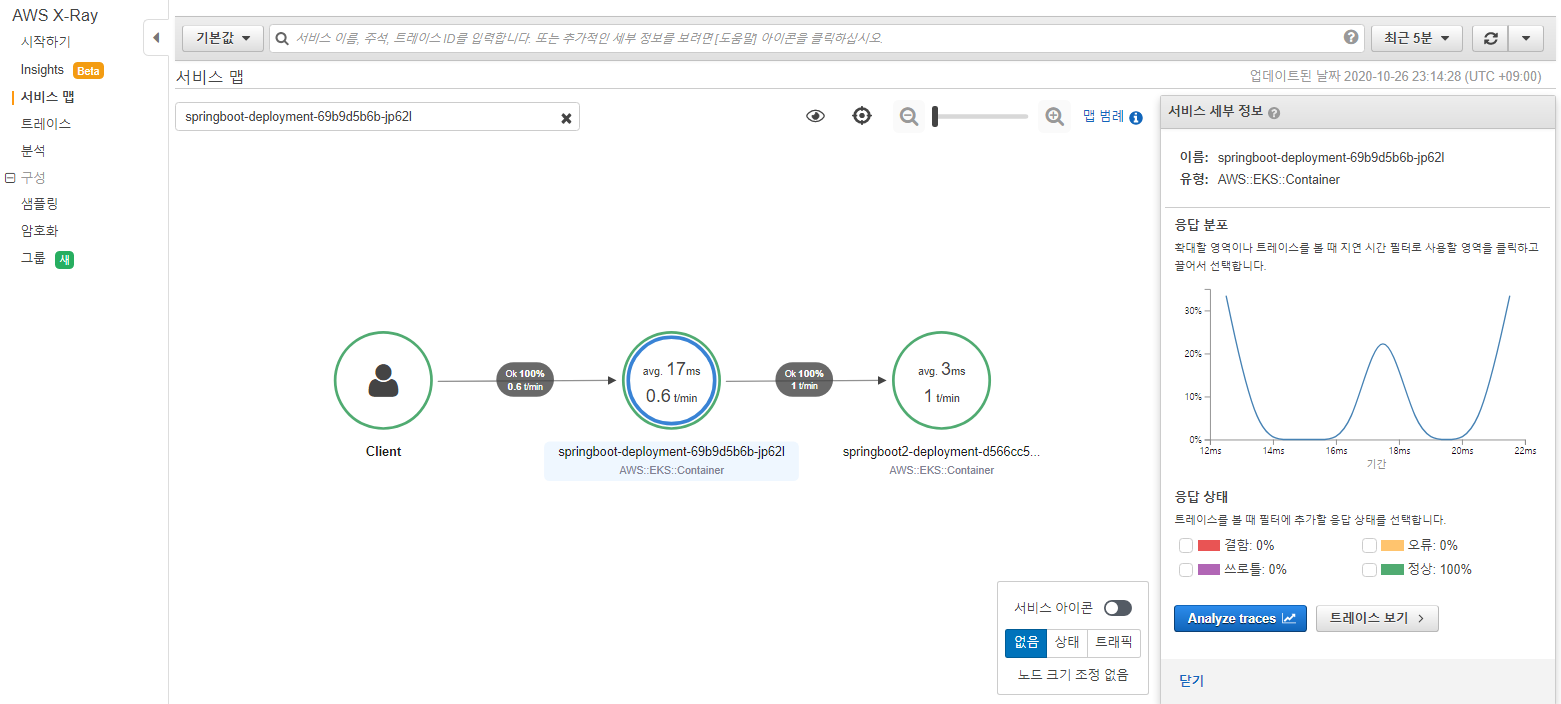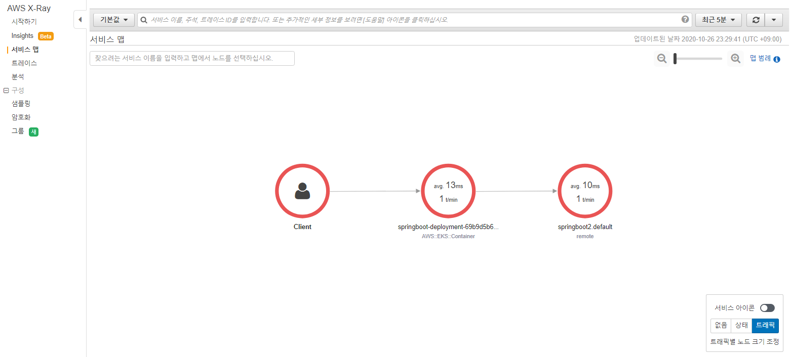 alb ingress가 사용하는 healthcheck url을 사전에 정의할 수 있다. 해당 url은 주기적으로 호출되는 URL이며, 이는 X-Ray에서 수집하지 않도록 앞서 sampling-rules.json에 정의하였다.