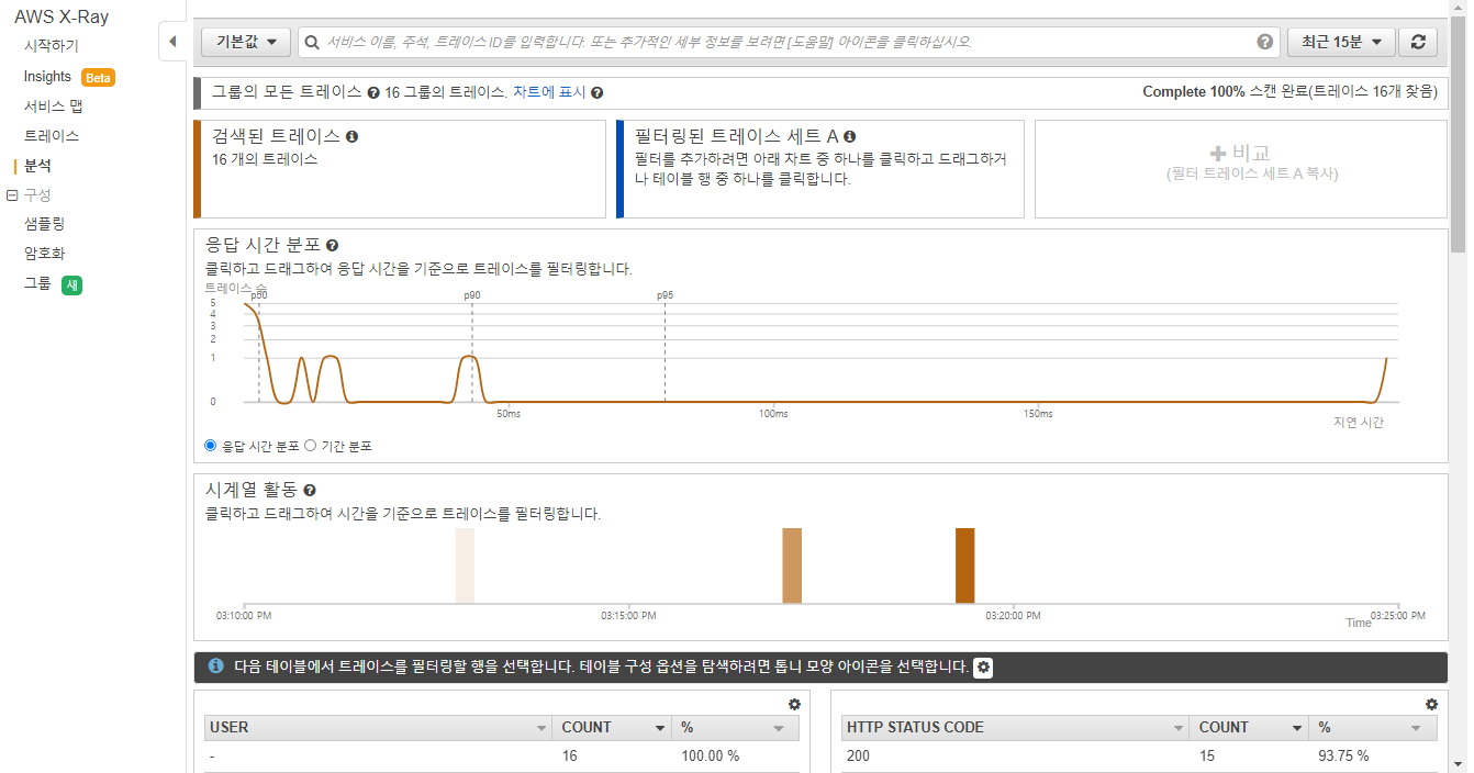 분석에서는 응답 시간 분포 그래프와 시계열 활동을 통해 요청의 흐름을 분석할 수 있다.