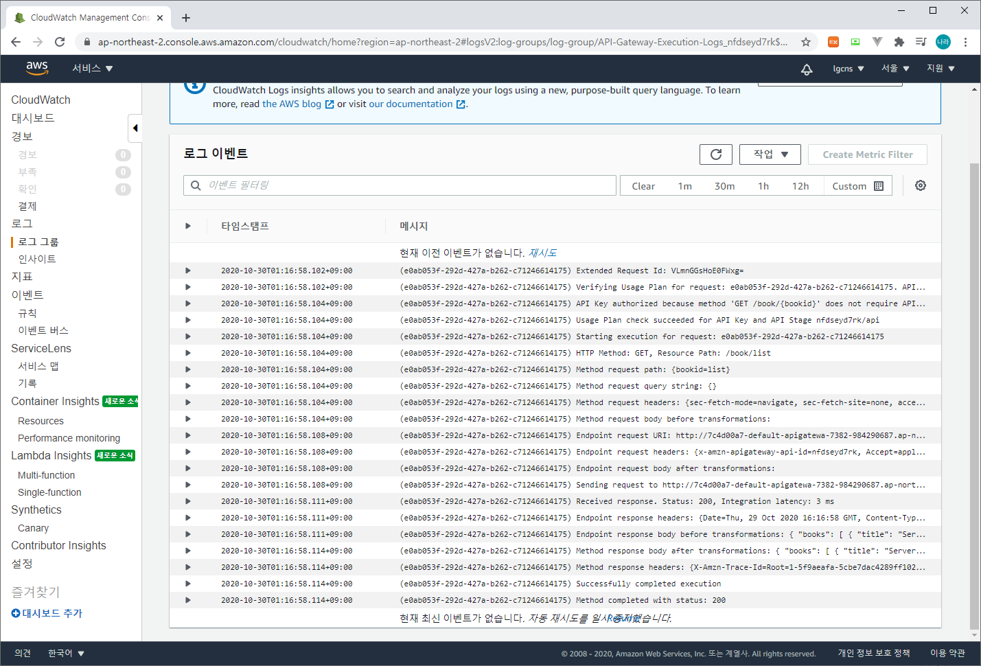 로그 그룹을 확인해 보면 아래와 같이 Api-Gateway-Execution-Logs-~~/api 로그 그룹이 생성된 것을 확인할 수 있다. 선택하면 아래와 같이 상세 정보를 확인할 수 있다. 또한 하단의 로그 스트림을 통해 로그를 확인할 수 있다.