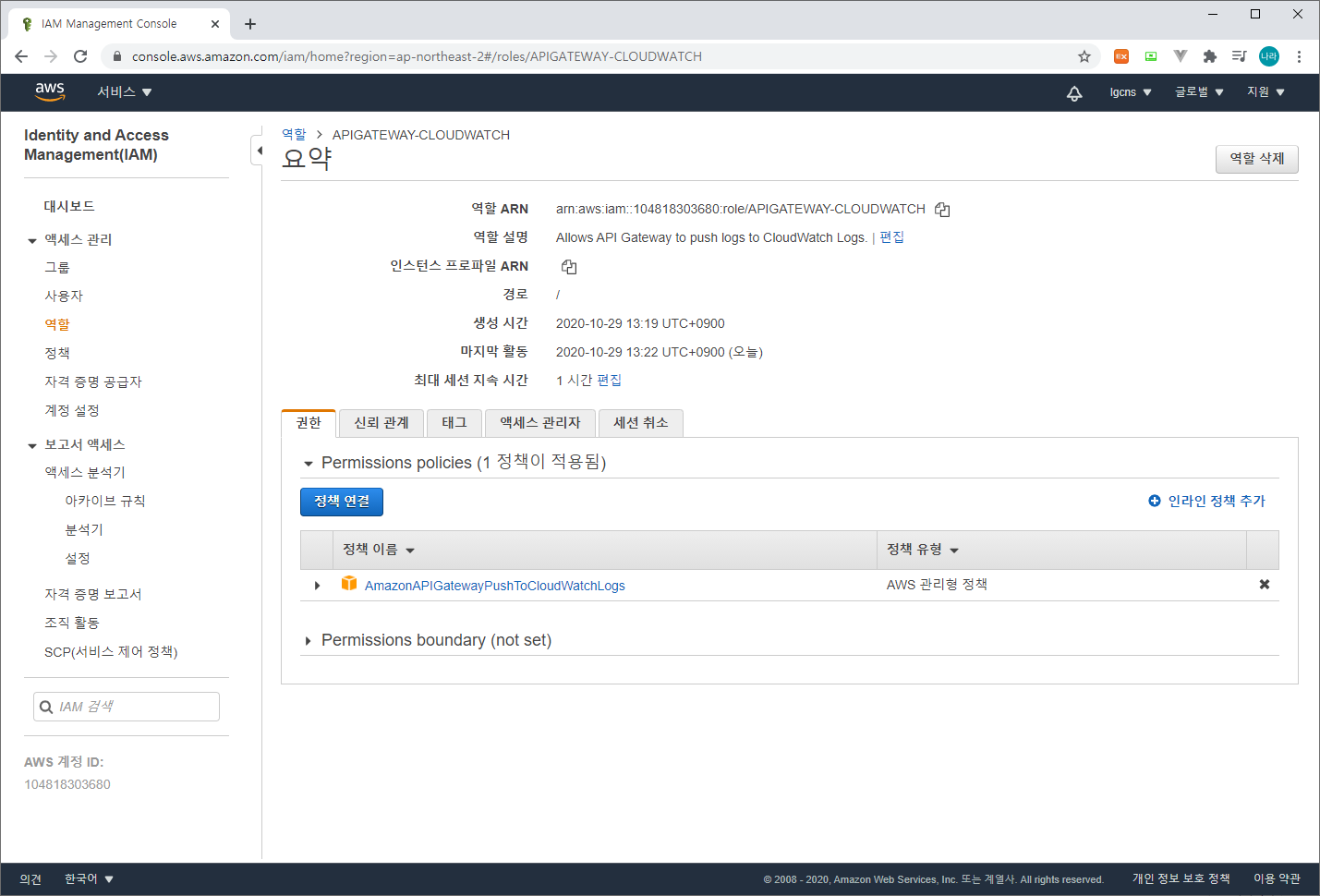 API Gateway를 모니터링하기 위해 다음과 같이 IAM > Role을 추가한다.