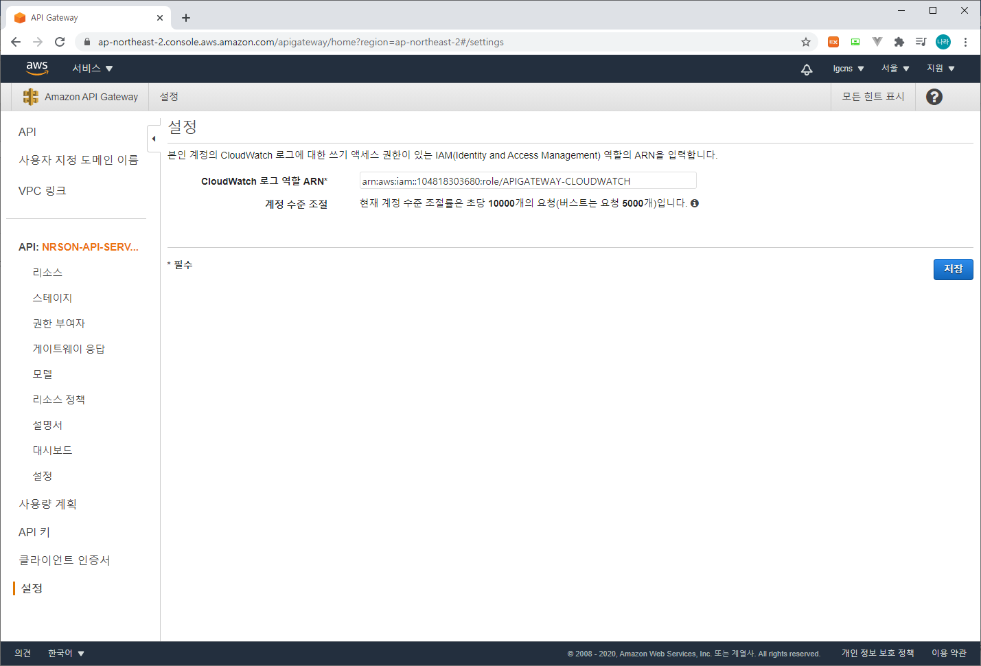 (API GATEWAY > API > NRSON-API-SERVICE > 설정 > CloudWatch 로그 역할 ARN)