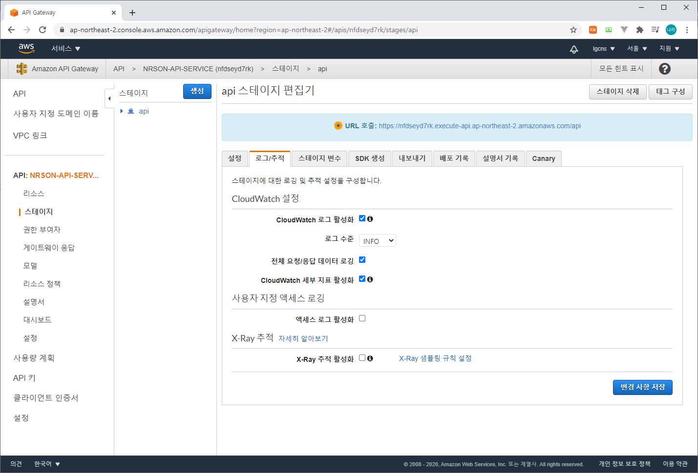 위와 같이 로그 수준은 INFO, CloudWatch 로그 활성화, 전체/요청 응답 데이터 로깅, CloudWatch 세부 지표 활성화를 선택하여 active 상태로 변경한 후 변경 사항을 저장한다.