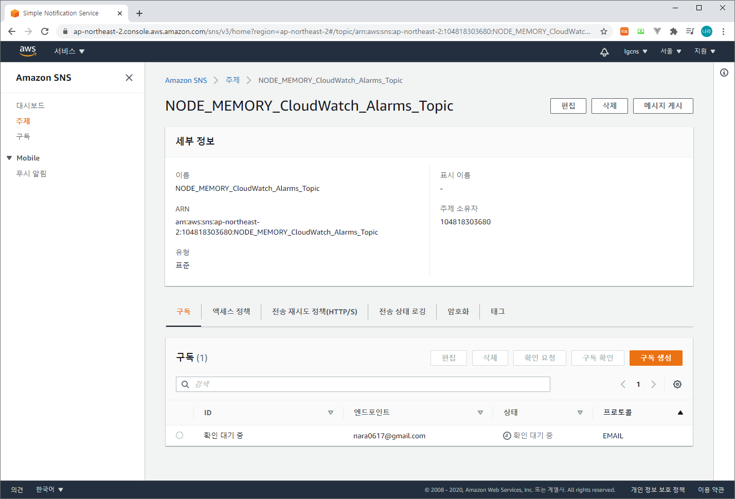 위와 같이 Amazon SNS의 Topic(주제)을 구독하고 있는 nara0617@gmail.com 사용자가 확인 대기 중인 상태이다.