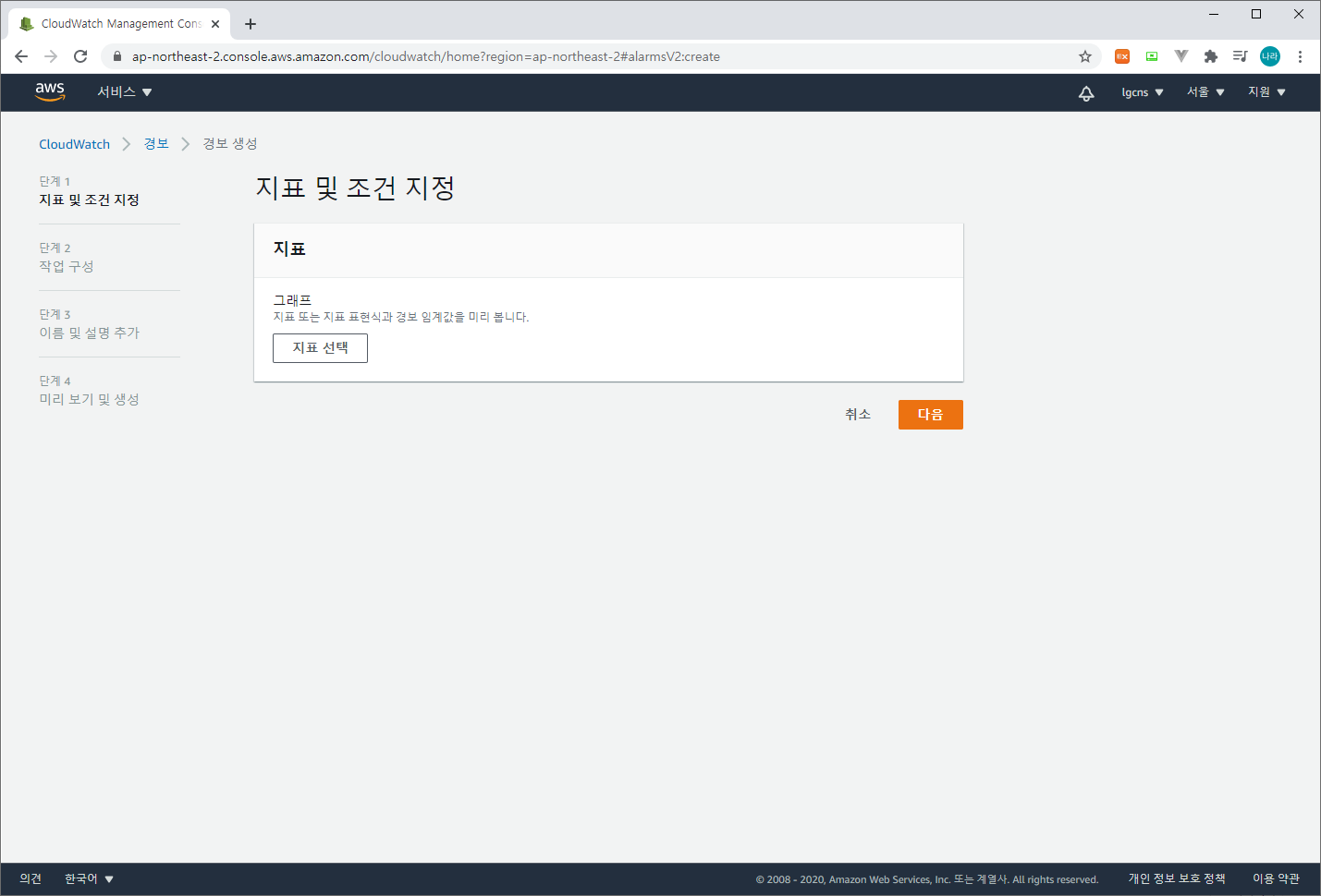 (CloudWatch > 경보 > 경보 생성)
