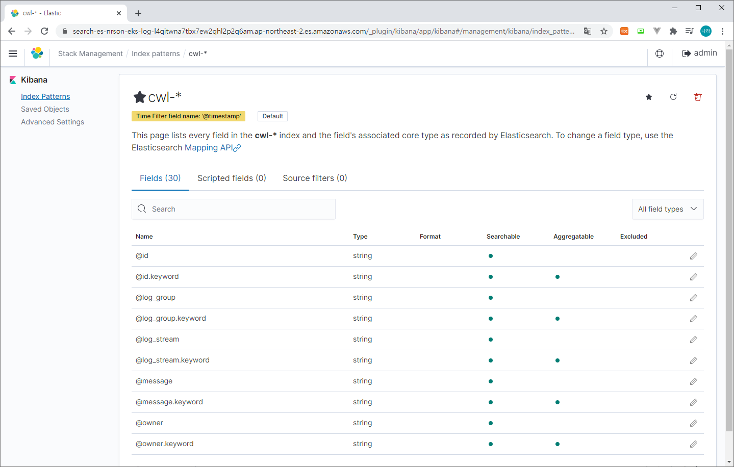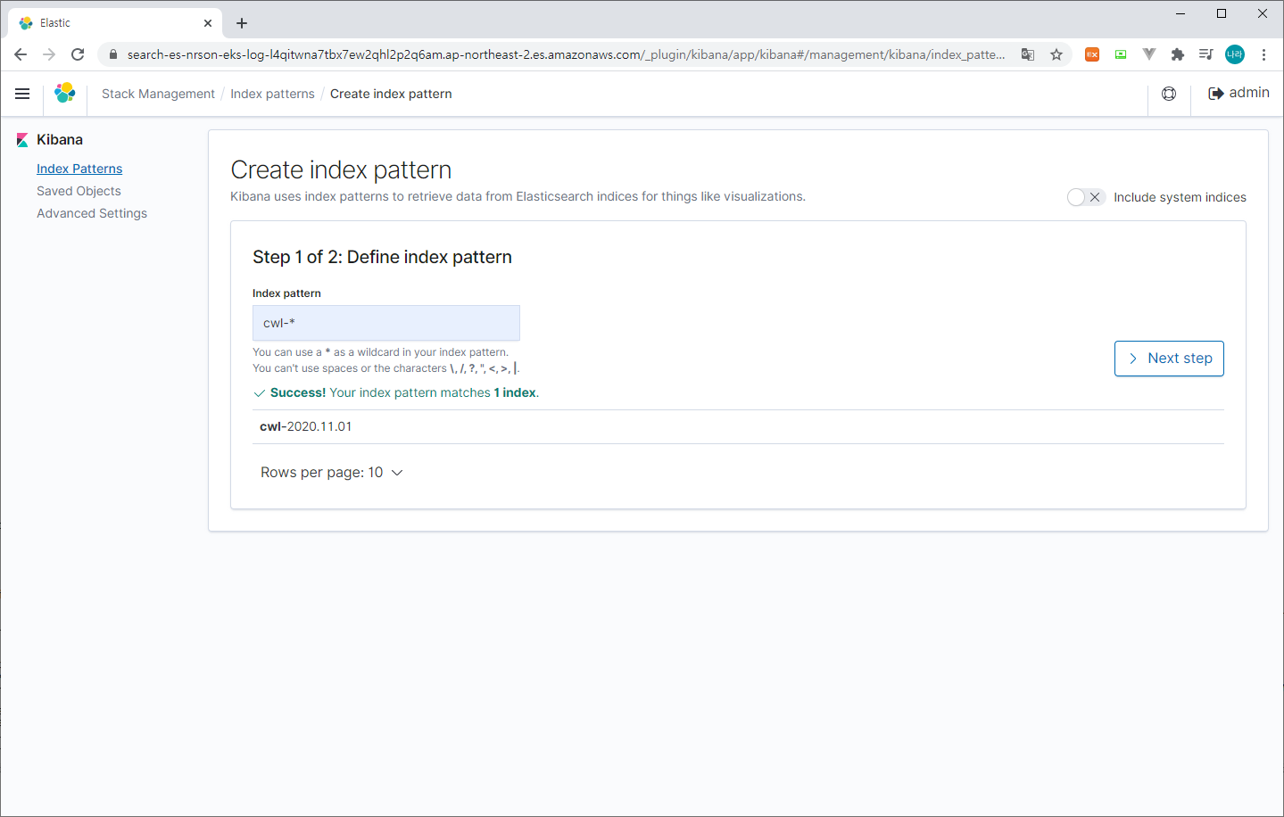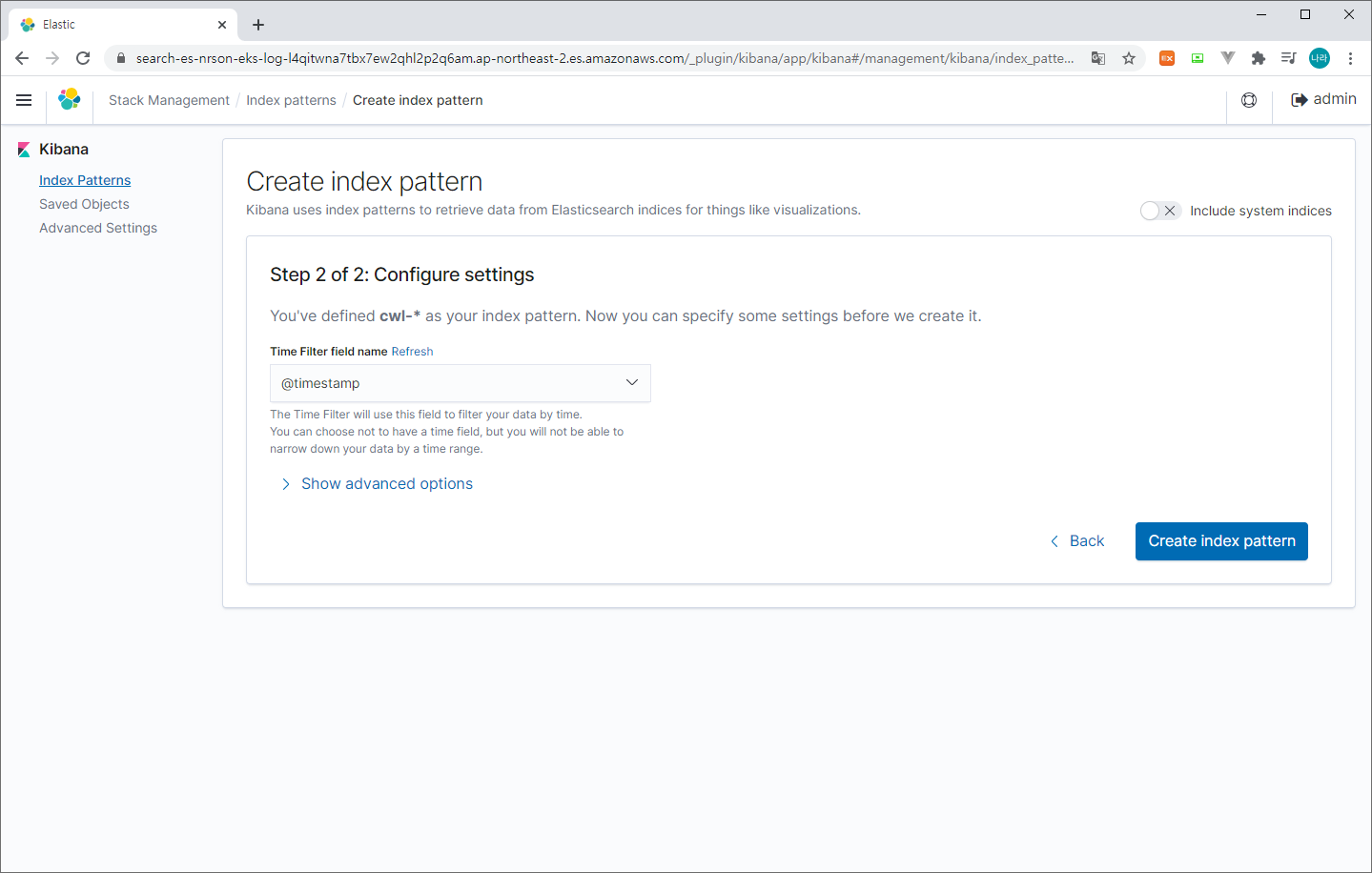 > Create index pattern (cwl-* 입력 > @timestamp > Create index pattern 선택)