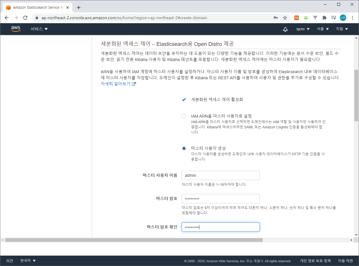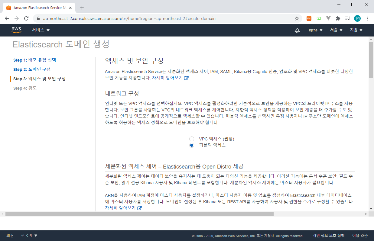 Step 3 : 액세스 및 보안 구성 (네트워크 구성, Kibana Admin 사용자 계정 구성, 엑세스 정책을 등록하고 관리한다.)