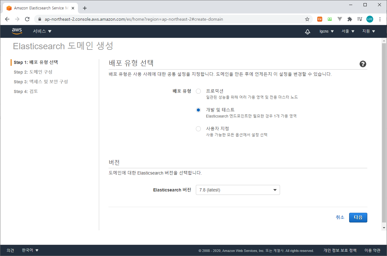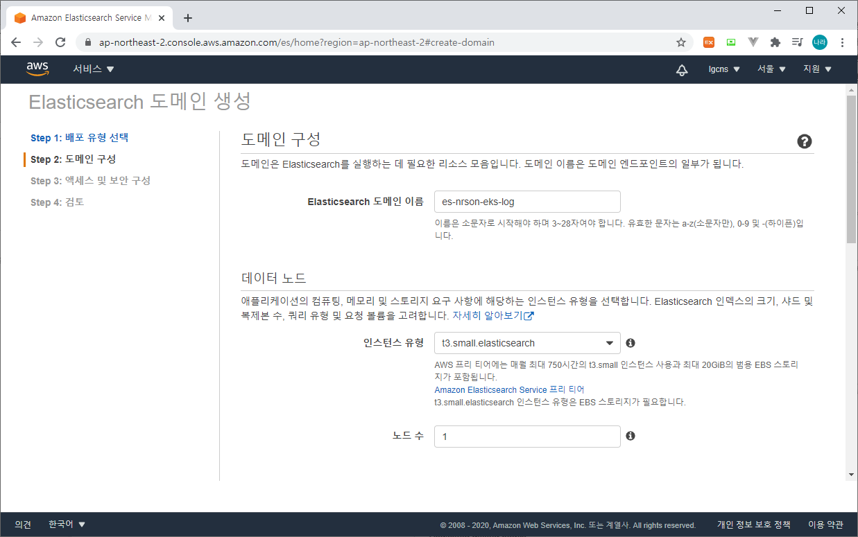 (ElasticSearch Service > 새 도메인 생성)
