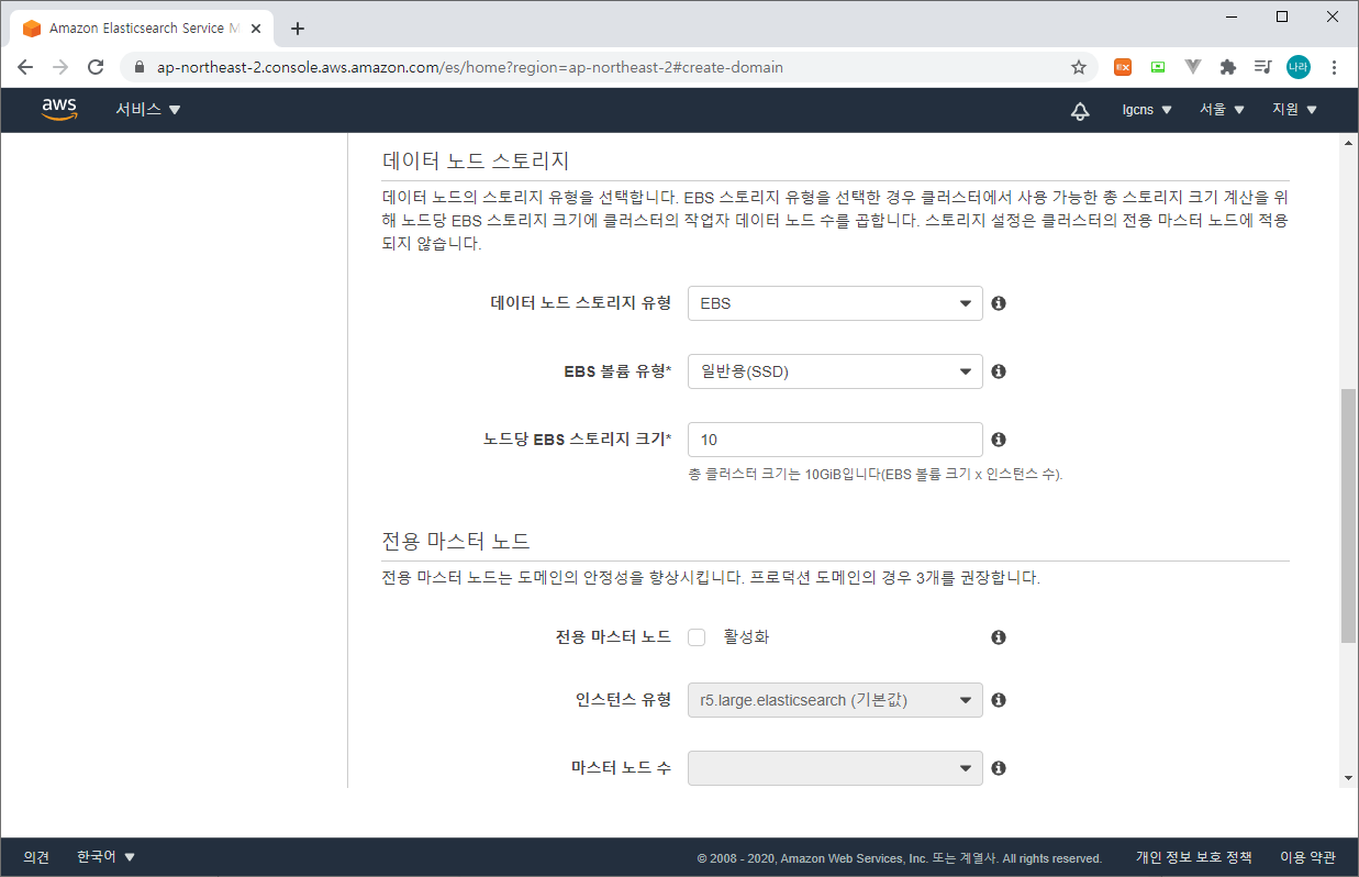 Step 2 : 도메인 구성 (데이터 노드의 인스턴스 유형과 노드 수, 데이터 노드 스토리지를 결정한다. 필요시 전용 마스터 노드를 구성하여 가용성은 높이도록 구성하며, 프로덕션 환경에는 구축을 권고한다.)
