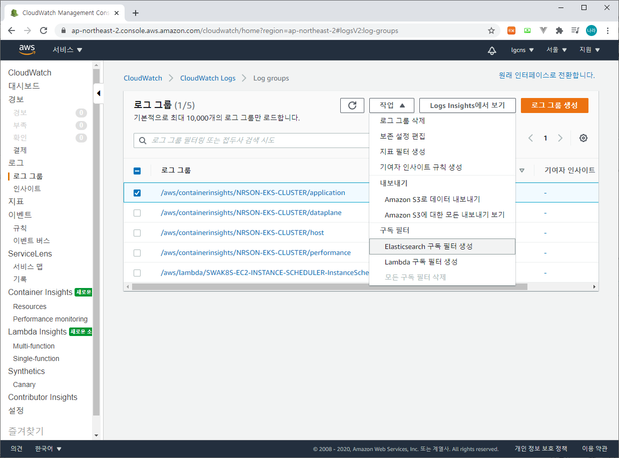 CloudWatch의 구독 필터를 생성할 로그 그룹을 선택하고 작업 > ElasticSearch 구독 필터 생성을 선택한다.