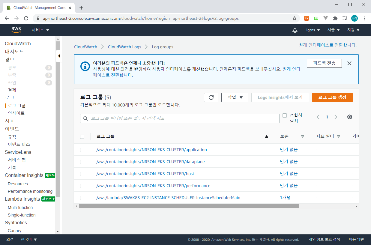 CloudWatch DaemonSet과 함께 FluentD DaemonSet이 구성된 것을 확인할 수 있다. 다음으로 CloudWatch에 FluentD를 통해 로그를 수집하고자 하는 로그 그룹이 생성되었는지 확인한다.