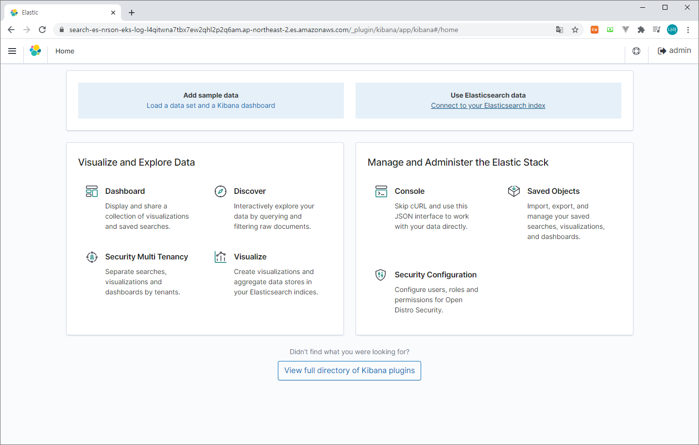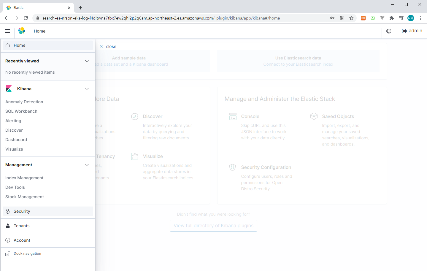 Kibana는 앞서 생성한 ElasticSearch Domain을 통해 확인할 수 있다.