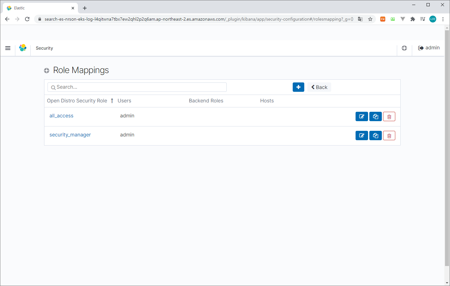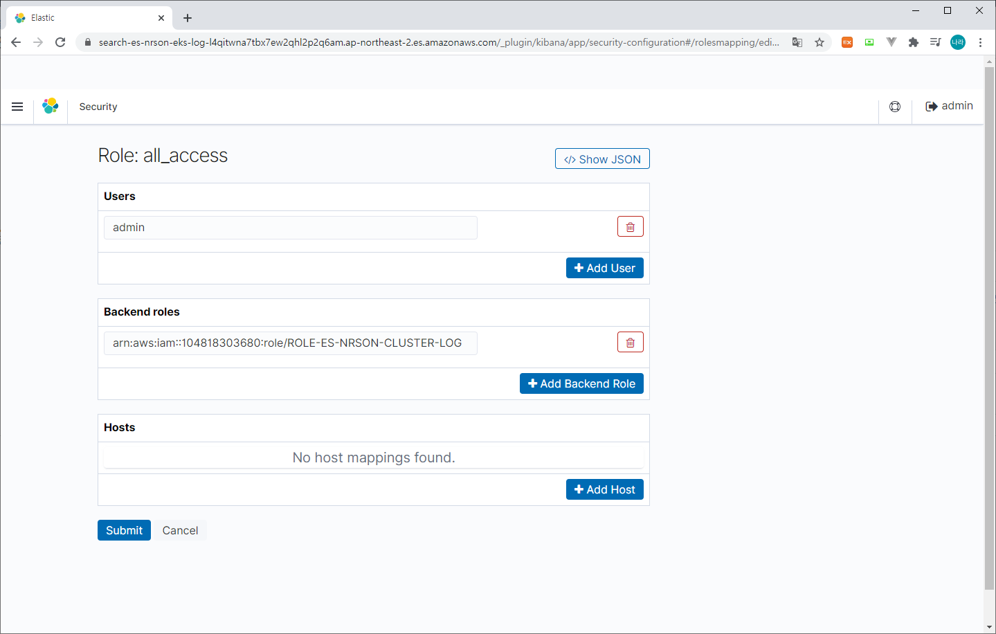 > Role Mappings & all_access 선택 후 앞서 생성한 Lambda Role 맵핑 (Backend roles)