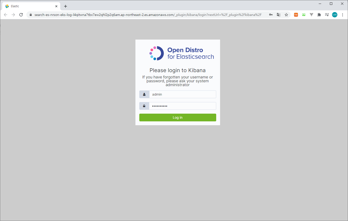 Kibana URL을 클릭하여 접속할 수 있으며, ID/PASSWORD는 Domain 생성 시 입력한 값이다.